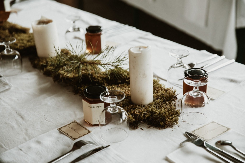 Alors pour le point déco, je dois avouer que je m’attendais à voir de très belles choses, connaissant le travail d’Ambre, je connais aussi ses goûts (et les partage !!). Je connais également son talent, mais alors là…. C’était comme si on m’emmenait à Poudlard à dos de licorne. La décoration de la salle, et surtout de la table, était un rêve éveillé !!! Une décoration de table toute en douceur et en textures, en nature avec de la mousse, des feuilles et branchages soigneusement choisies, des nappes et vaisselles tout à fait à mon goût (vraiment, je me serais crue dans une de mes boards pinterest haha!) et pour chaque invité : un pot de miel de La Miellerie des Monts Brumeux (AKA : le papa de Rune !). J’avais un petit pot pour moi aussi… si vous saviez comme je conserve précieusement tous les petits cadeaux d’invité quand je photographie ce genre d’évènements… Et bien celui-ci est déjà vide ! Un régal, et je suis vraiment fan du design choisi pour l’étiquette, la forme du pot… De la simplicité sophistiquée : la perfection.