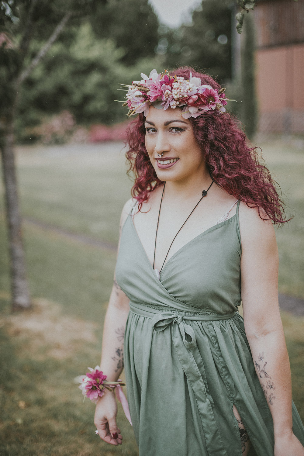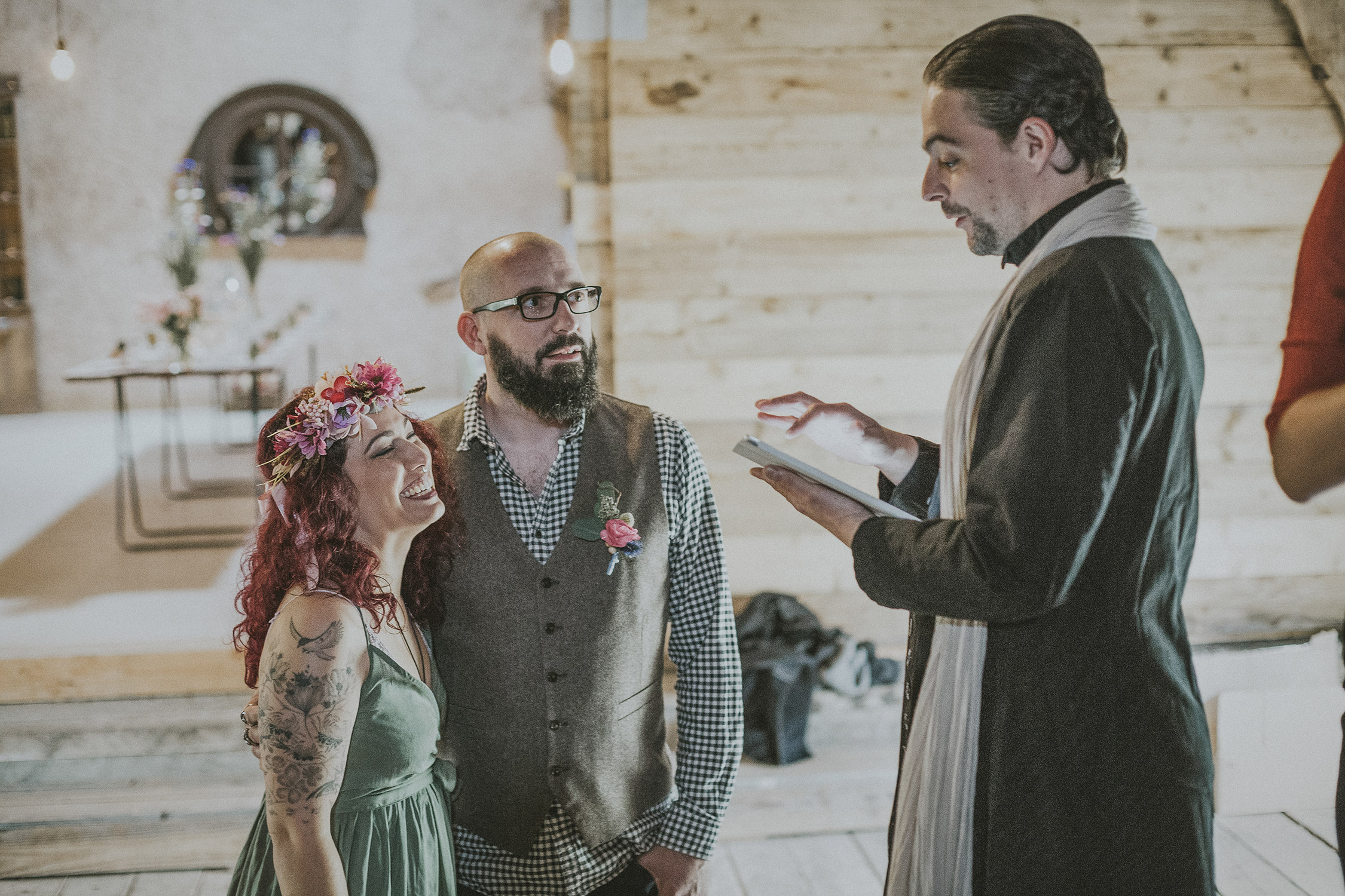 Monessa souhaitait intégrer dans son mariage une touche wiccane. La Wicca est une religion très ancienne qui prône le culte de la nature, des animaux, des êtres humains… (Elle vous en parlerait beaucoup mieux que moi !) C’est ainsi que le couple a décidé de s’unir selon les termes Wicca, pour 1 an et 1 jour (bail renouvelable, histoire de pouvoir continuer à faire la fête tous les ans !). La cérémonie, officiée par un ami adepte des jeux de rôles, parsemée d’humour et de joie, était tantôt émouvante et belle, tantôt drôle et joviale, tantôt vraie et très poignante. J’ai beaucoup aimé la partie sur le rituel des rubans, où chacun pouvait amener un souhait, une valeur ou une pensée aux mariés.
