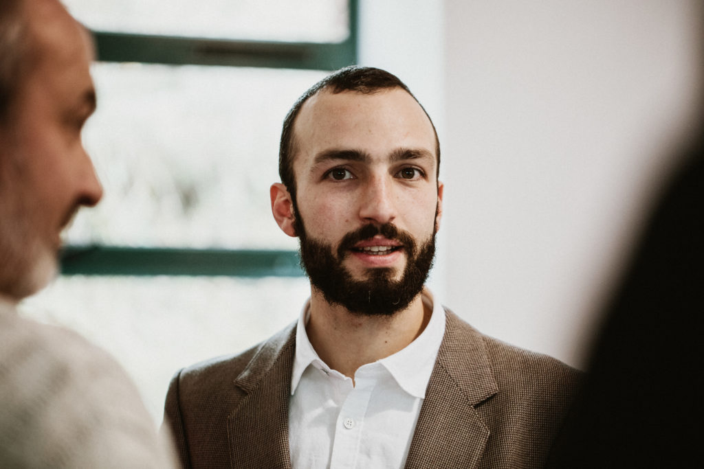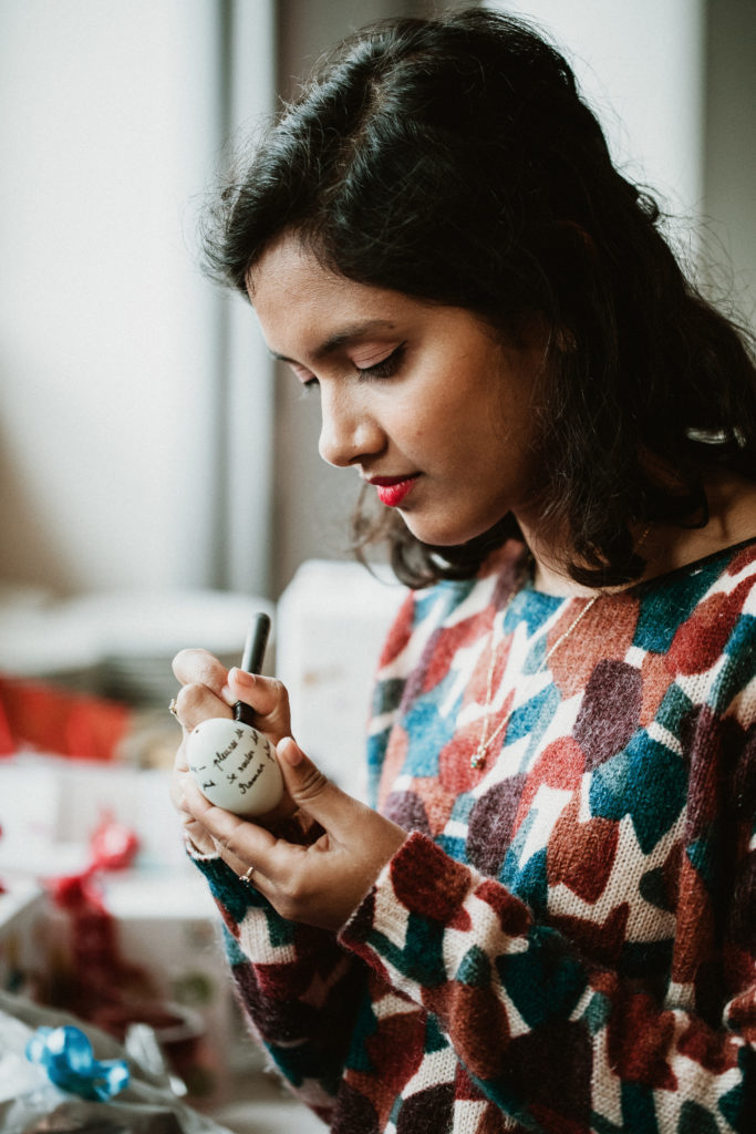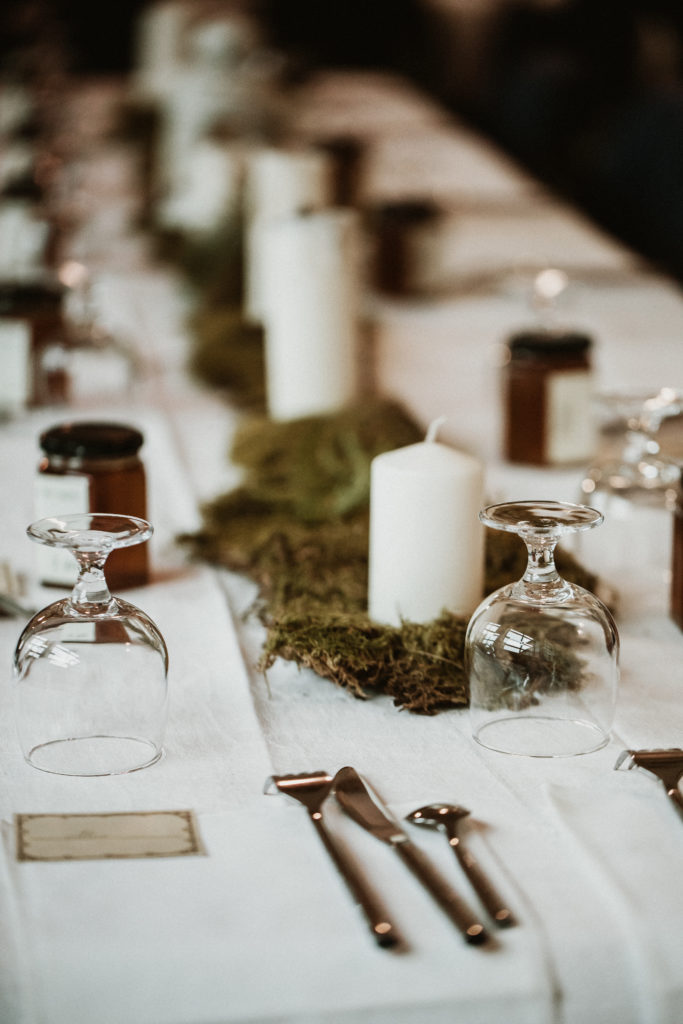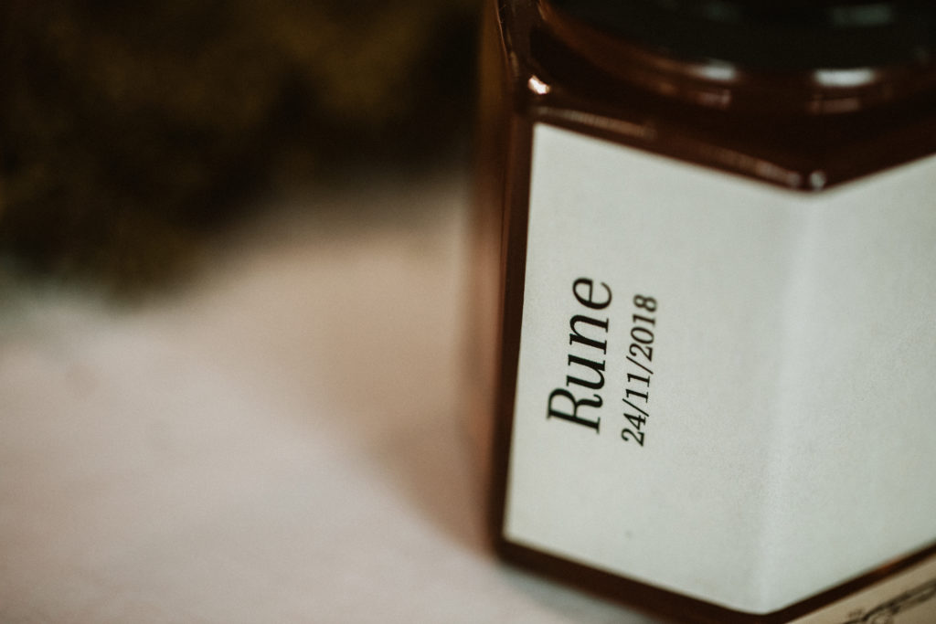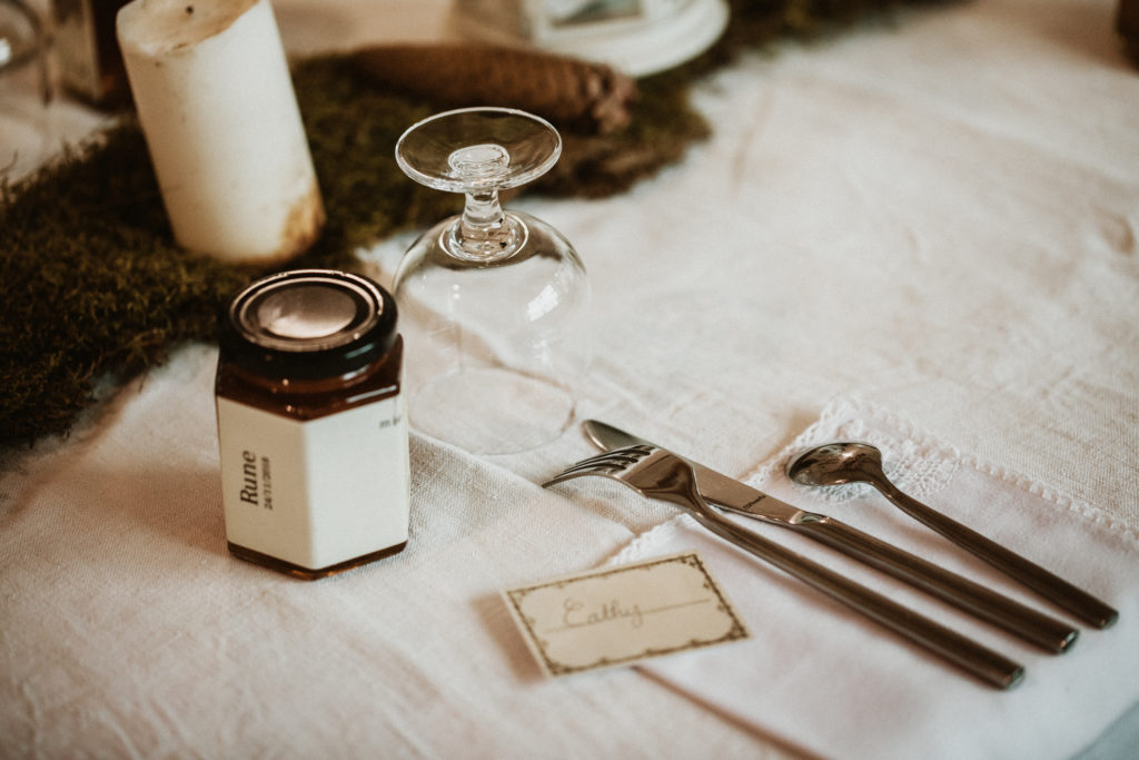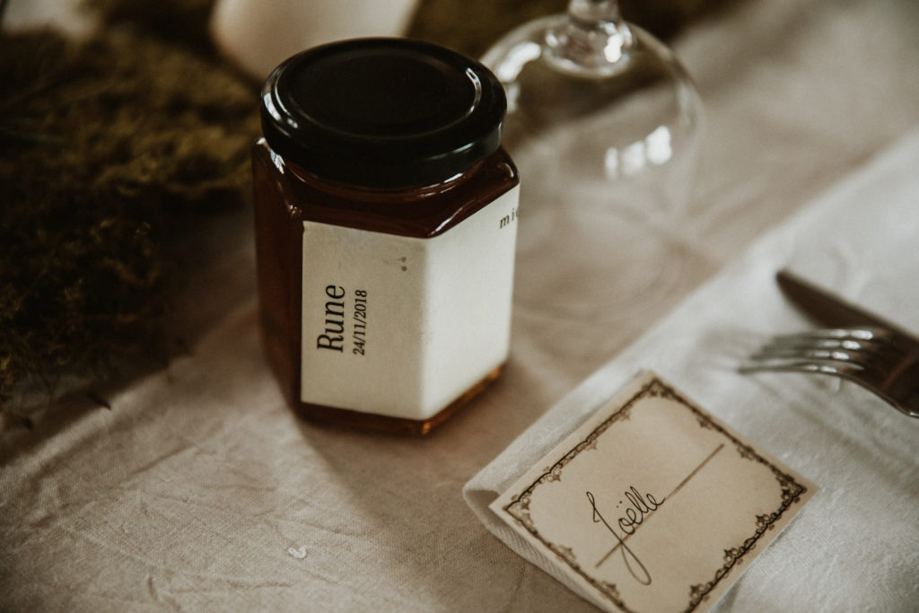 Alors pour le point déco, je dois avouer que je m’attendais à voir de très belles choses, connaissant le travail d’Ambre, je connais aussi ses goûts (et les partage !!). Je connais également son talent, mais alors là…. C’était comme si on m’emmenait à Poudlard à dos de licorne. La décoration de la salle, et surtout de la table, était un rêve éveillé !!! Une décoration de table toute en douceur et en textures, en nature avec de la mousse, des feuilles et branchages soigneusement choisies, des nappes et vaisselles tout à fait à mon goût (vraiment, je me serais crue dans une de mes boards pinterest haha!) et pour chaque invité : un pot de miel de La Miellerie des Monts Brumeux (AKA : le papa de Rune !). J’avais un petit pot pour moi aussi… si vous saviez comme je conserve précieusement tous les petits cadeaux d’invité quand je photographie ce genre d’évènements… Et bien celui-ci est déjà vide ! Un régal, et je suis vraiment fan du design choisi pour l’étiquette, la forme du pot… De la simplicité sophistiquée : la perfection.