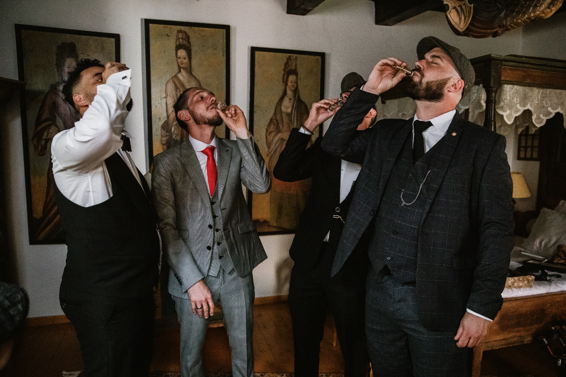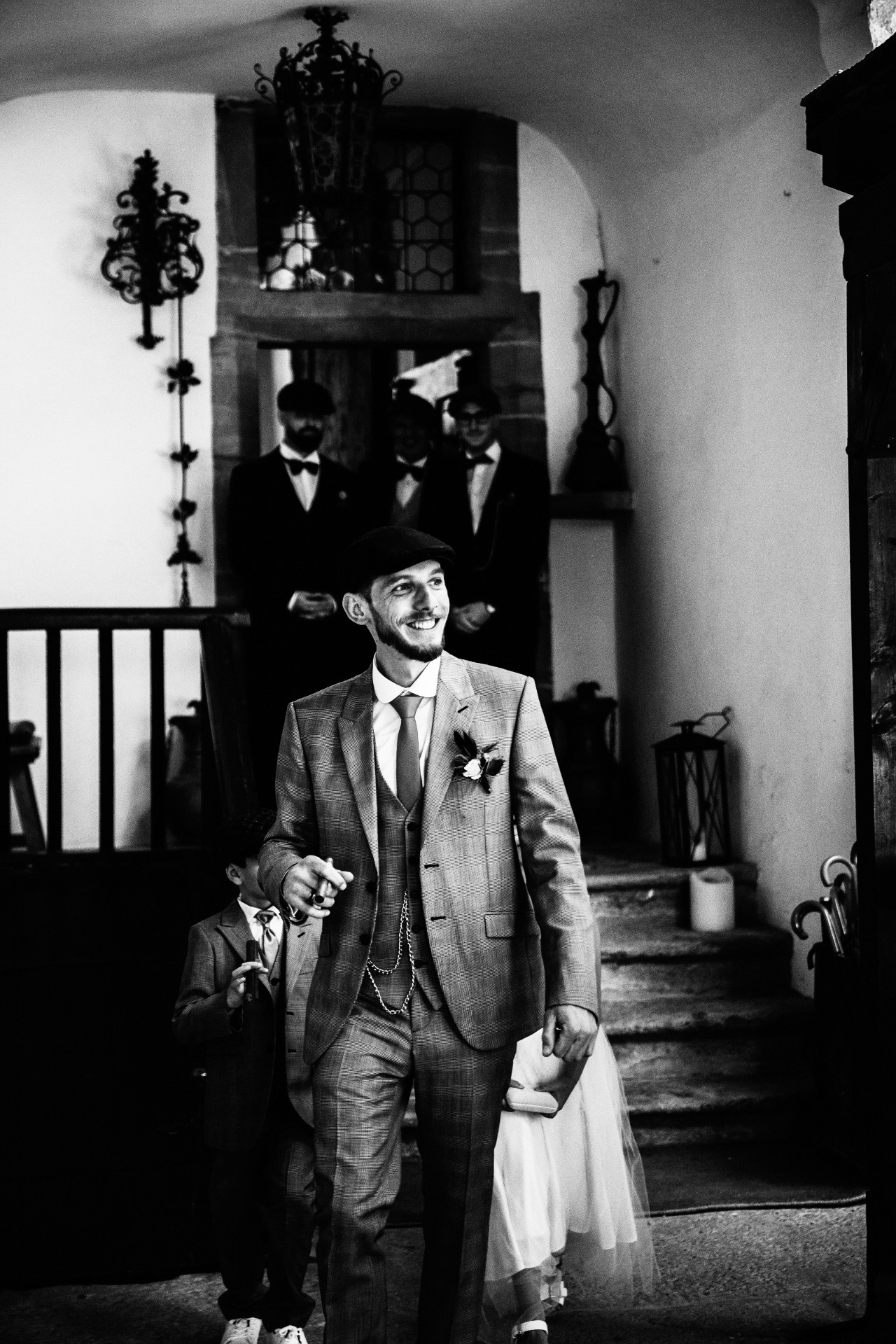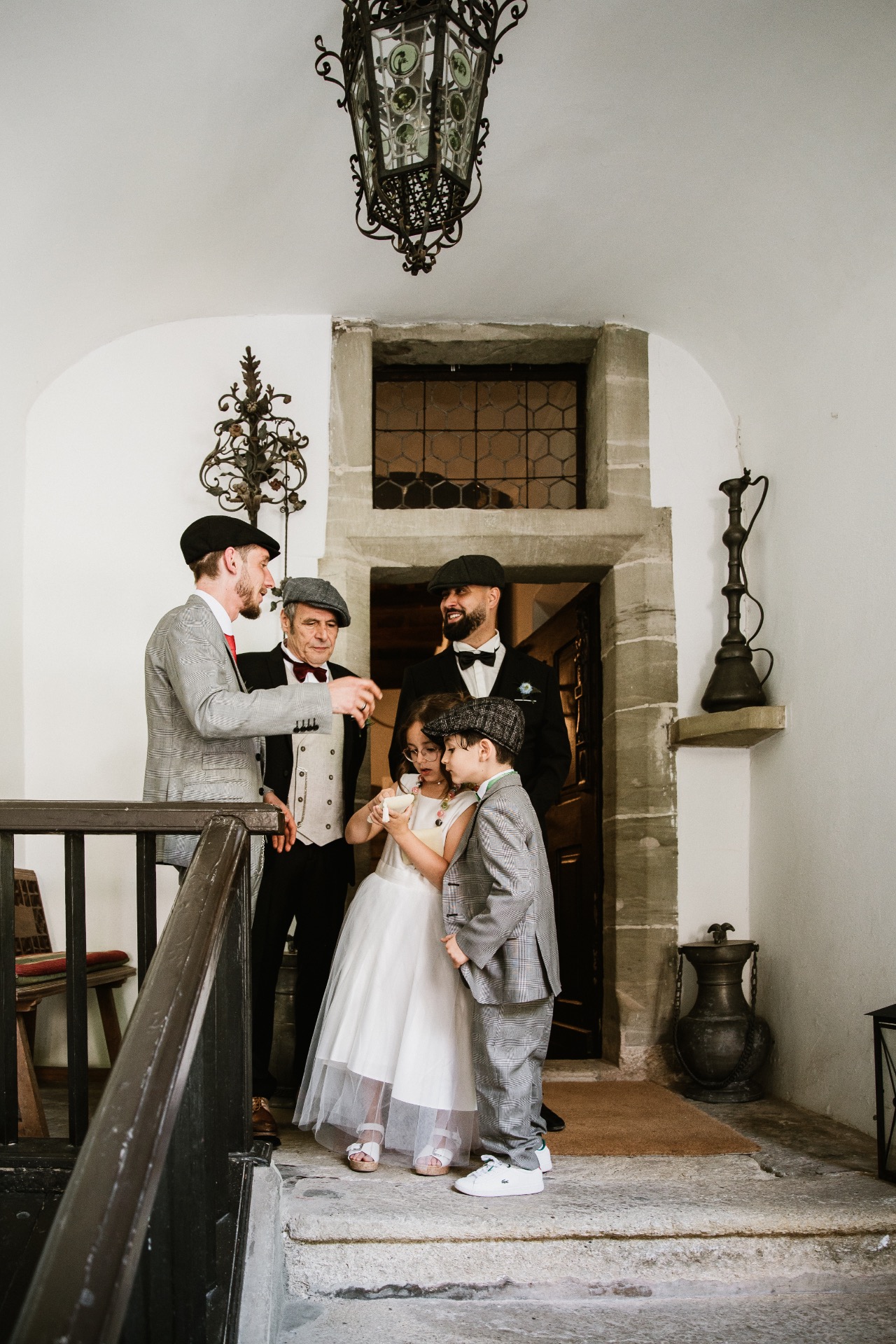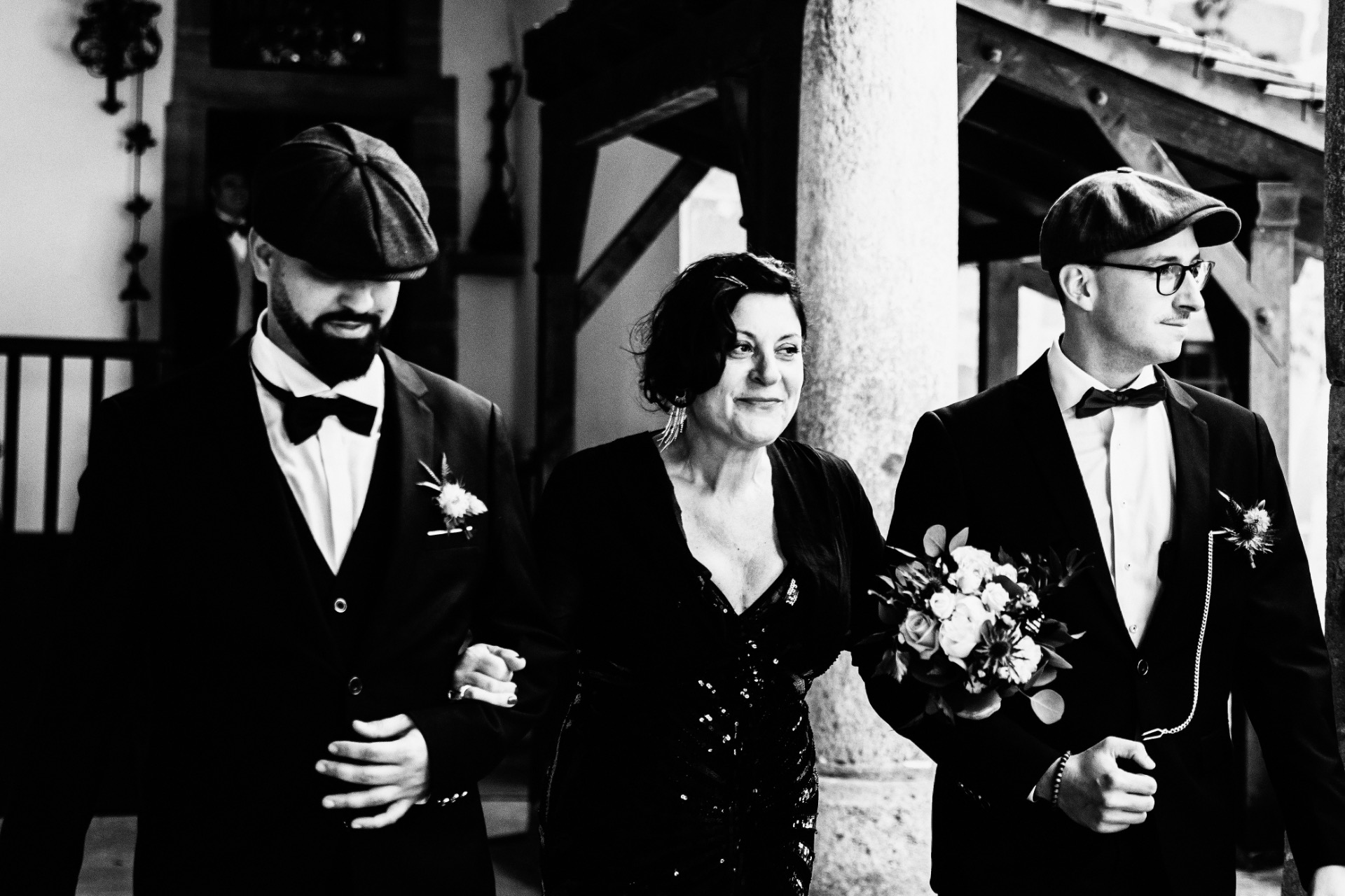 On avait tellement d’idées de photos trop stylées d’eux deux, pour lesquelles le château se prêtait à merveille ! Nous avons aussi pu faire des photos absolument dingues d’eux et leurs proches en full Peaky Blinders : On s’est éclatés. 🤩