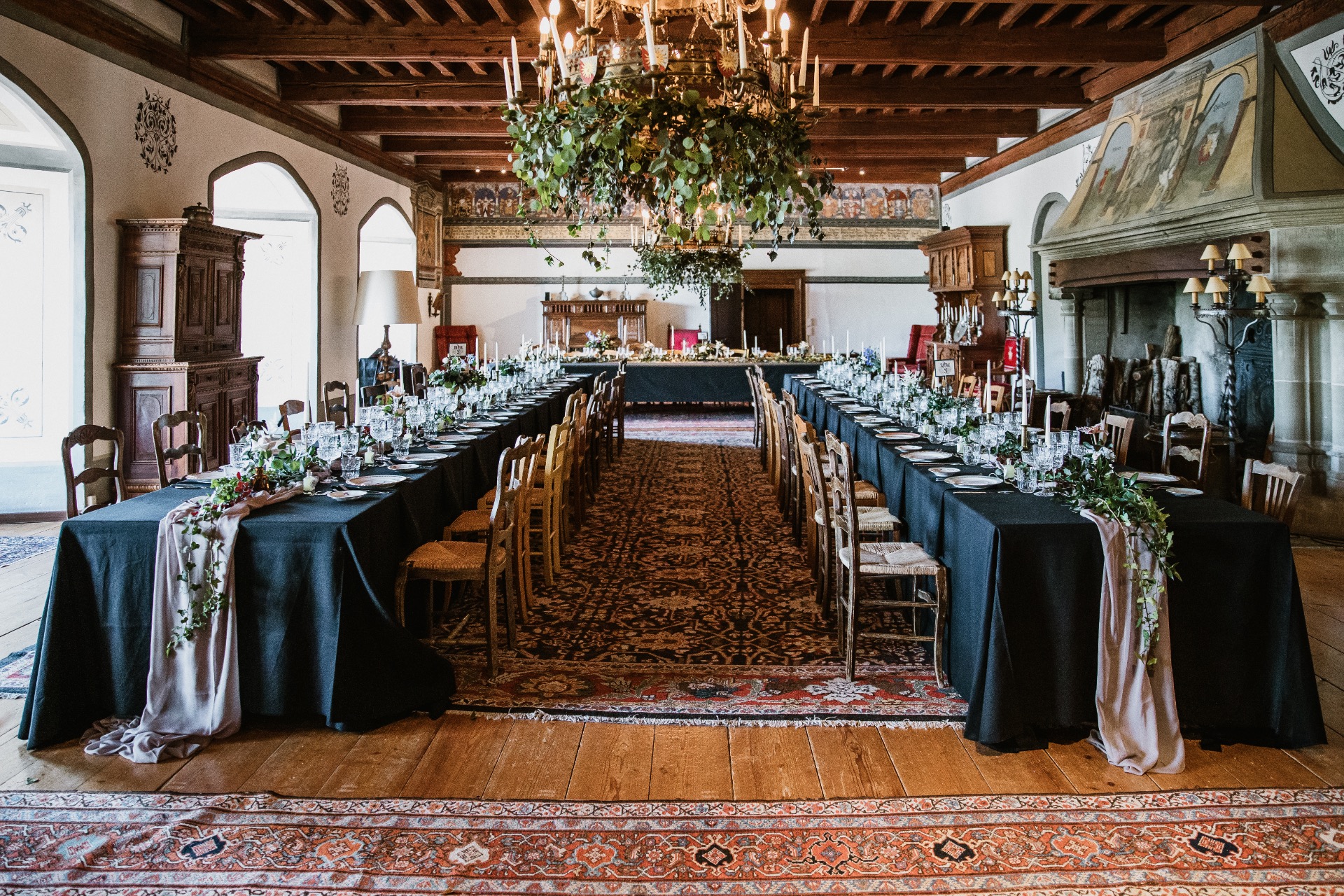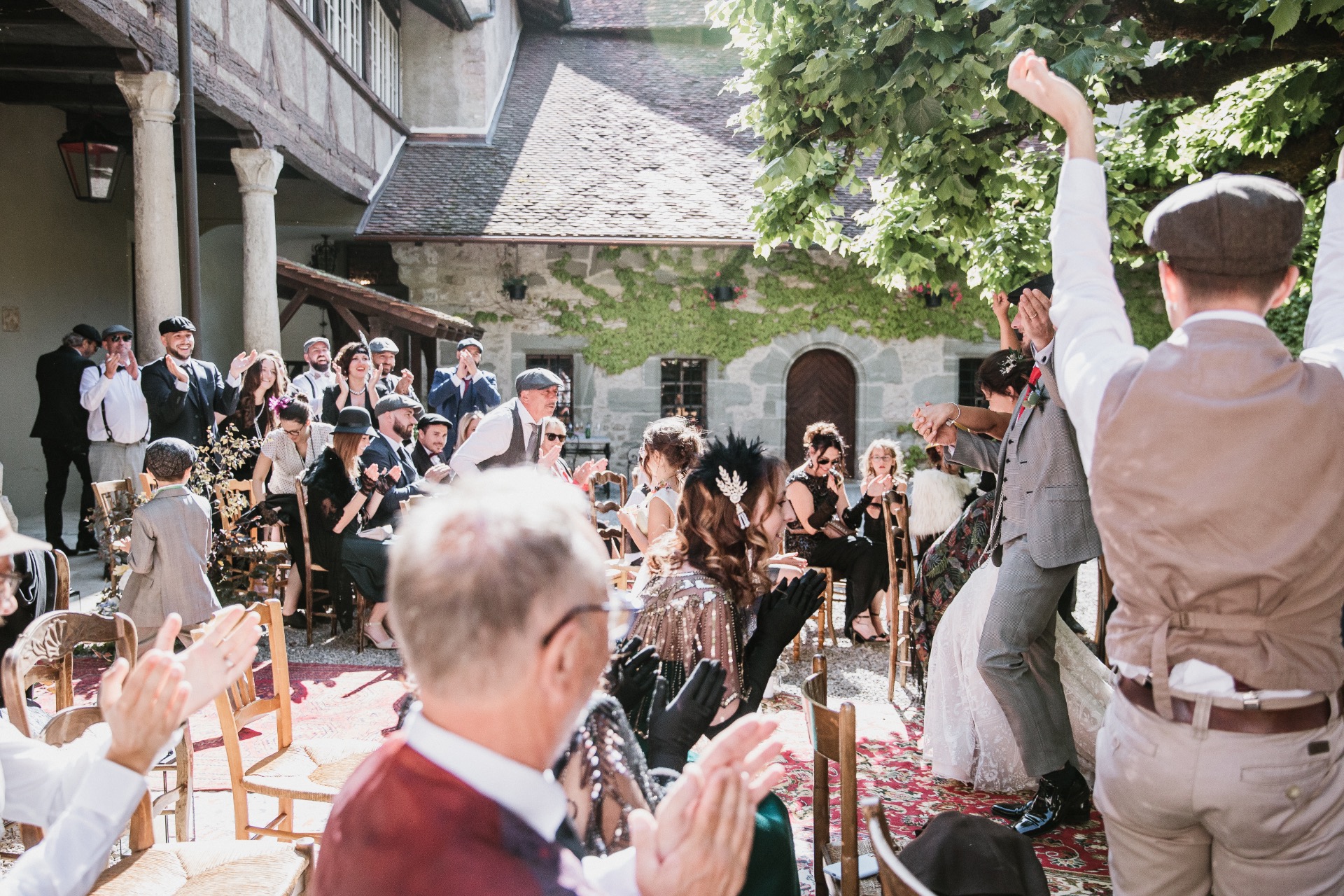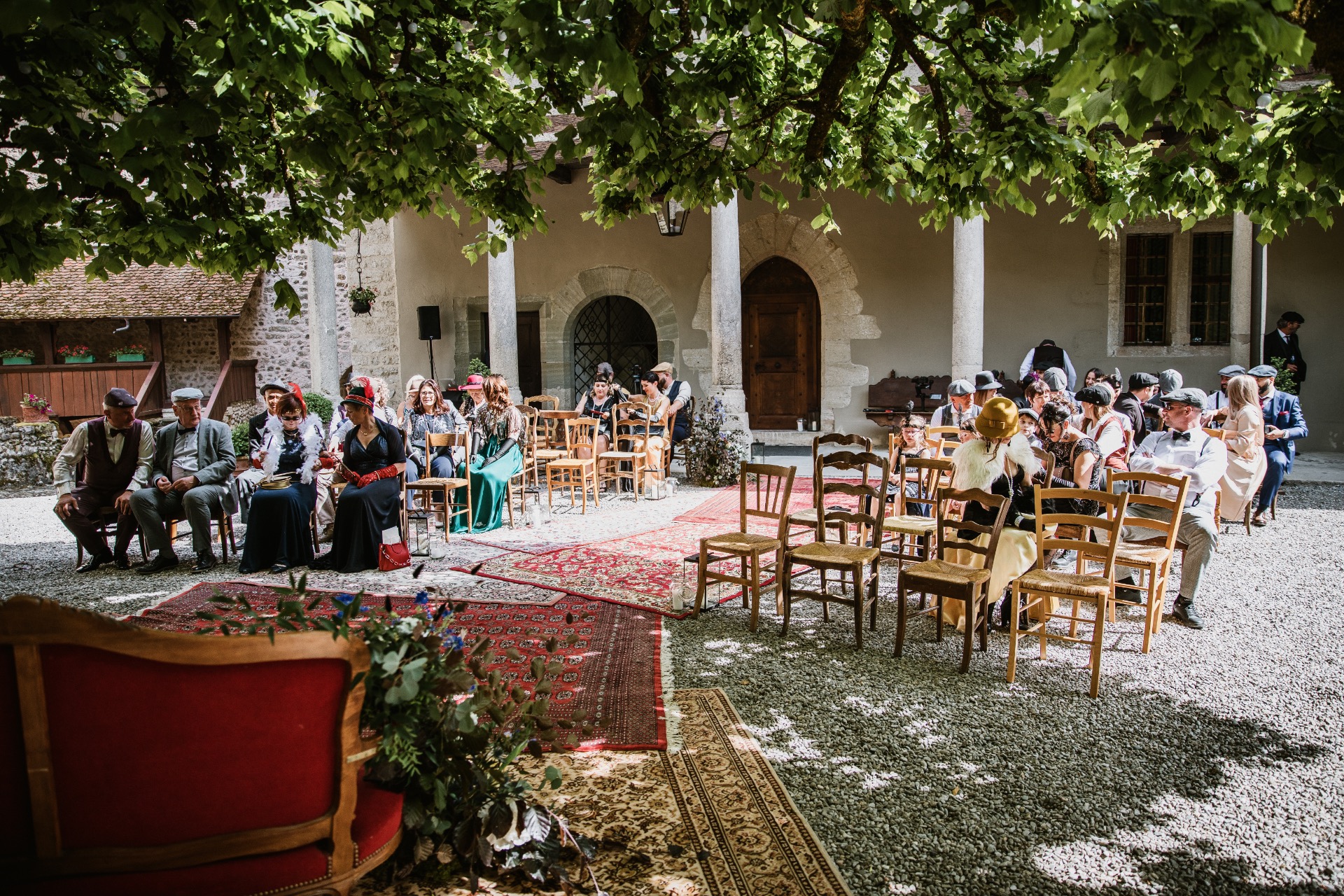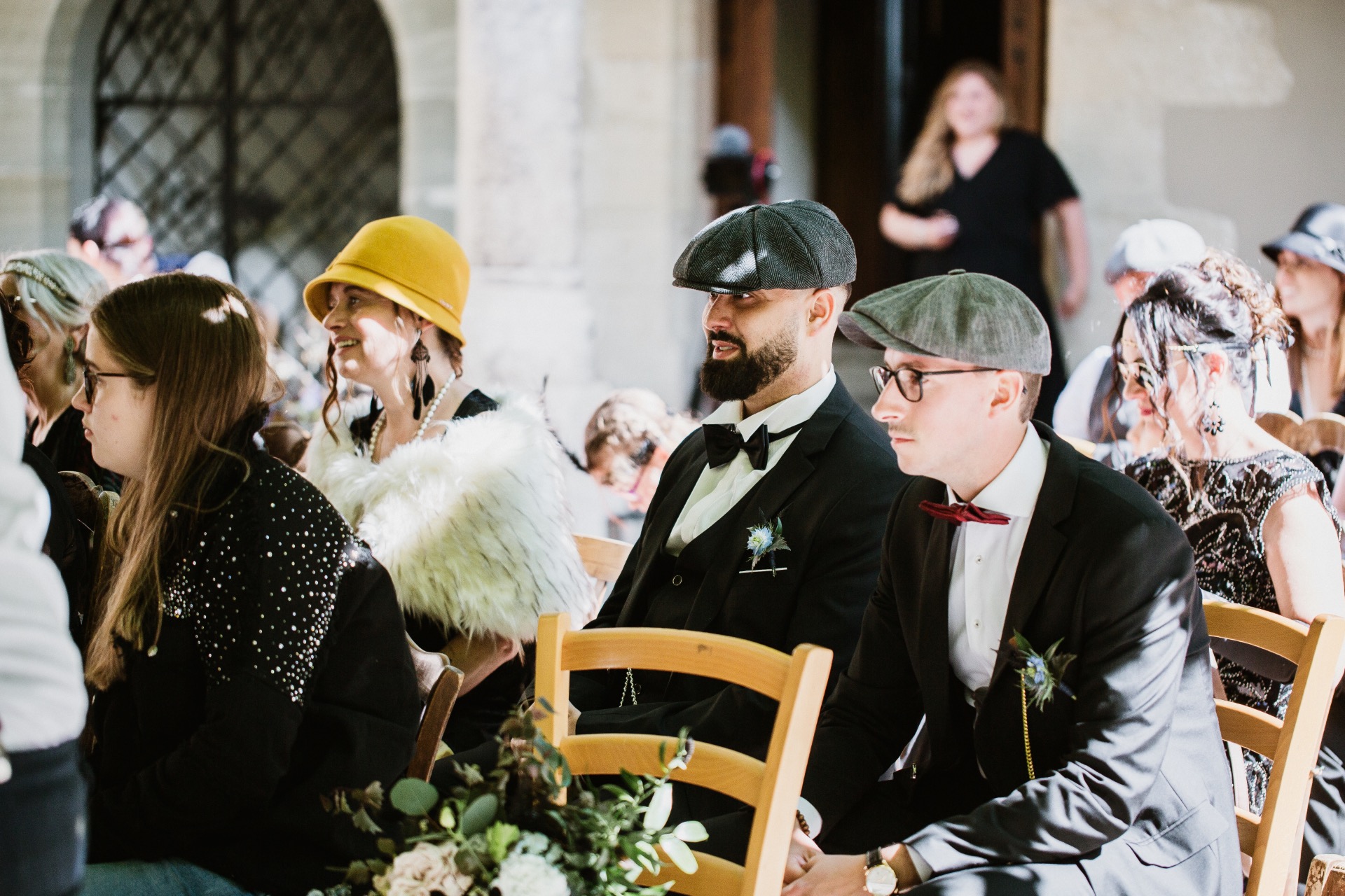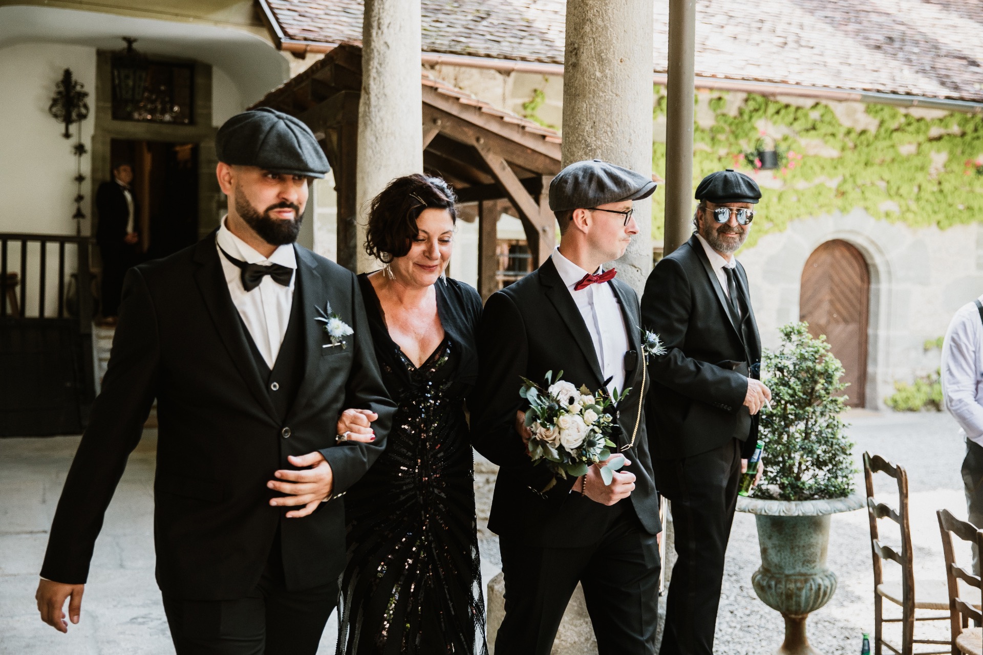 Lustre, dorures et peintures occupent déjà fortement l’espace de la salle de souper, il faut alors trouver comment habiller la salle pour la rendre festive, mais aussi respecter ce fameux thème de Mariage Peaky Blinders ! Quant à la cérémonie, cette cour intérieure du château de Lucens dans le canton de Vaud s’y prête à merveille.