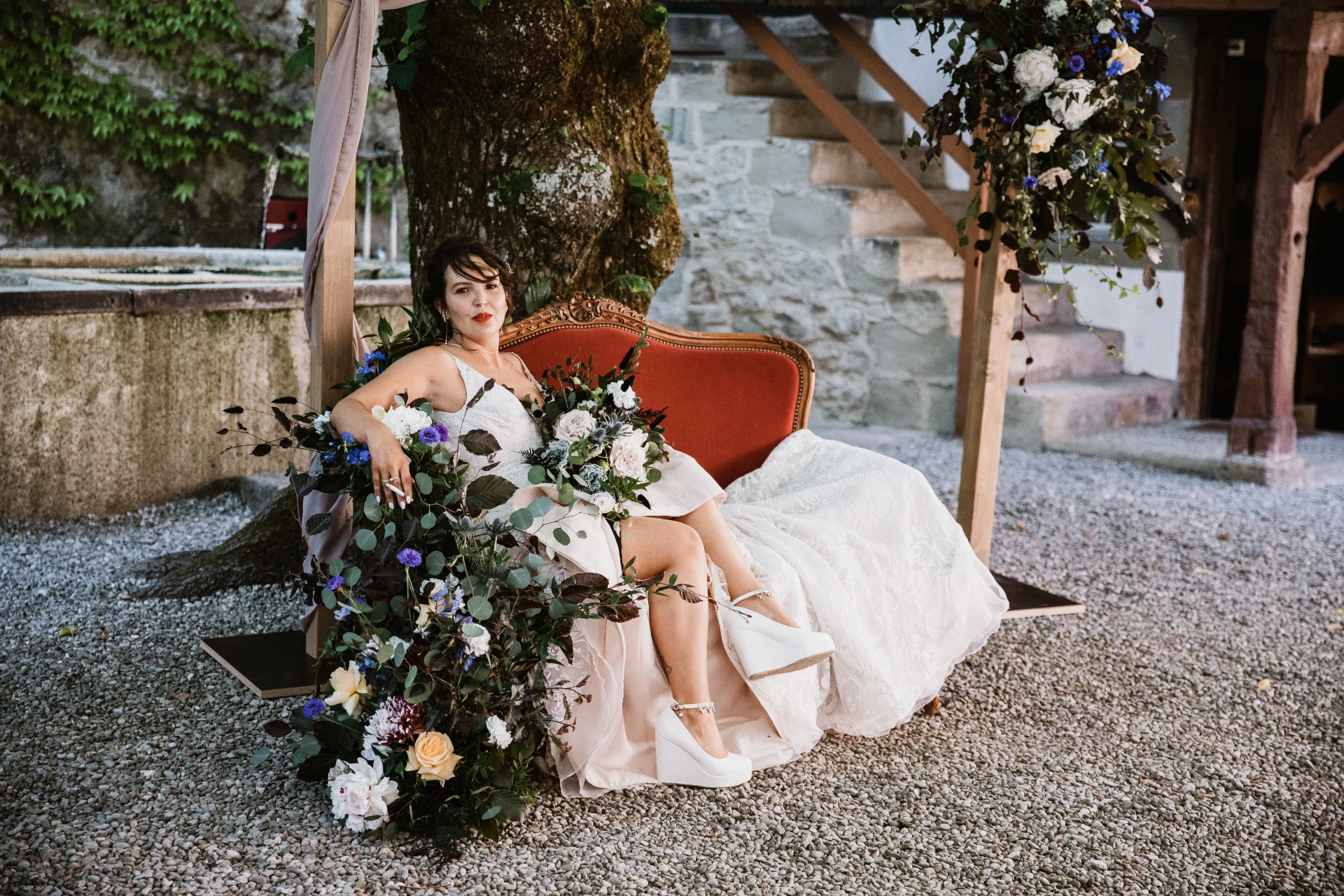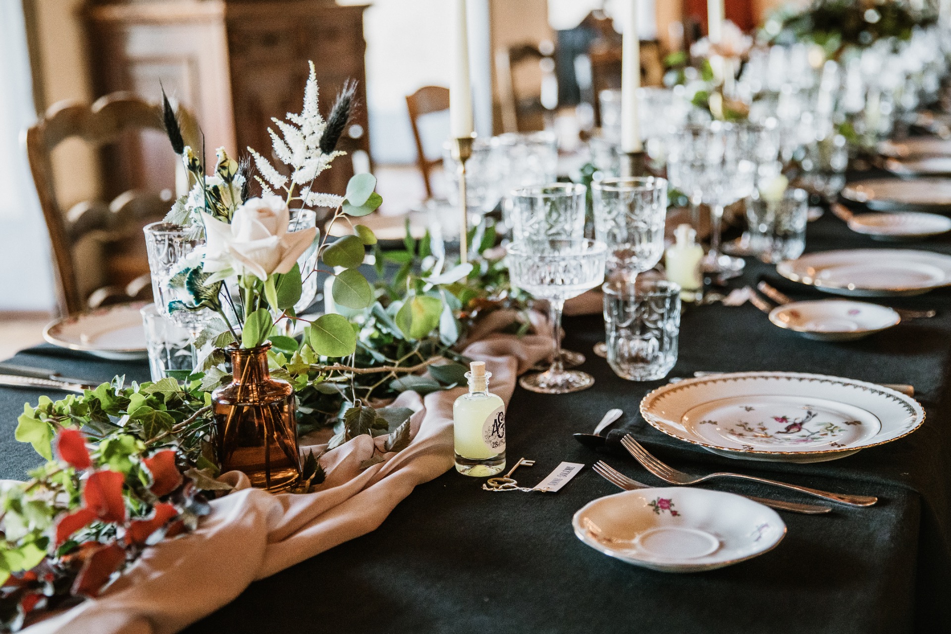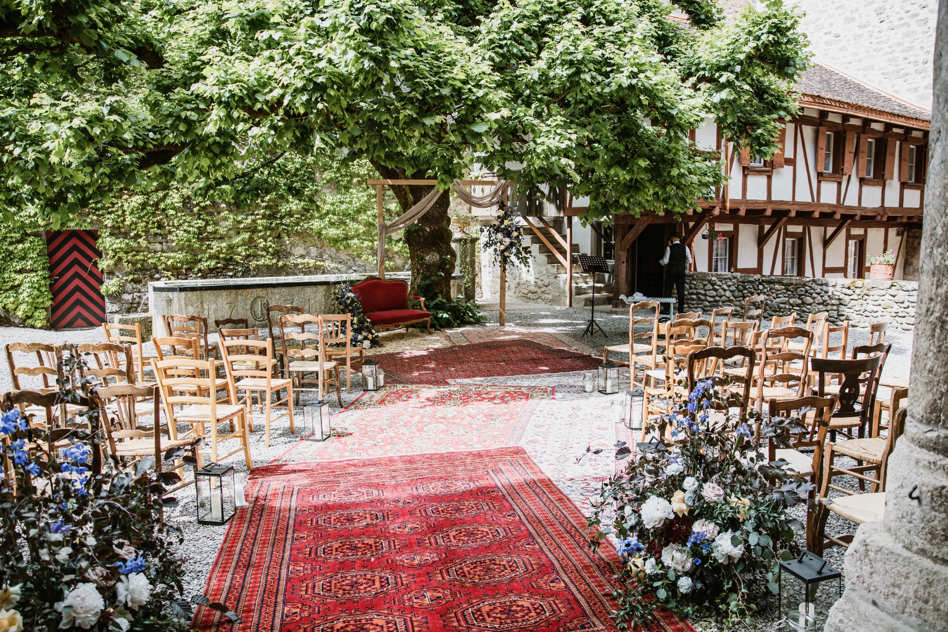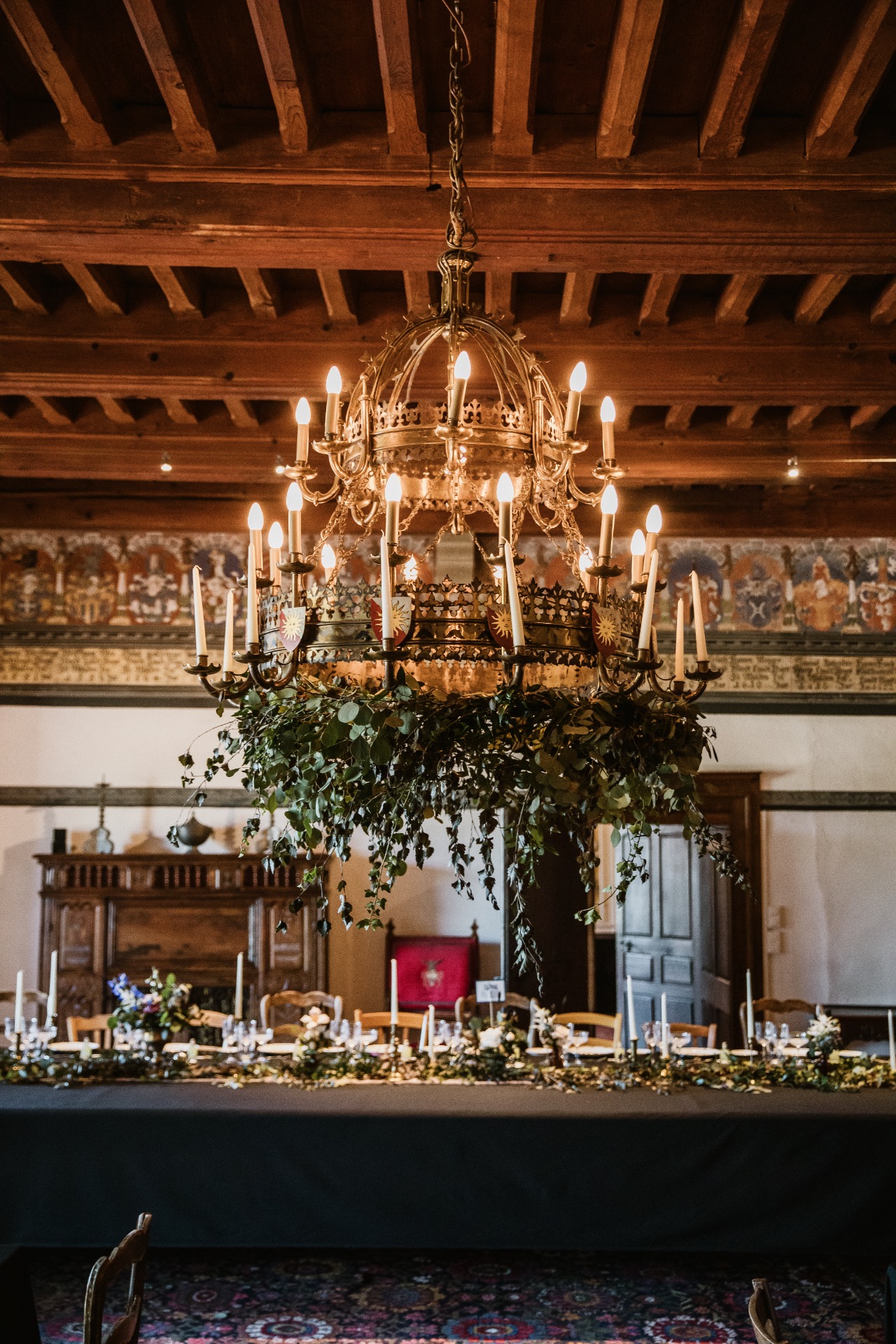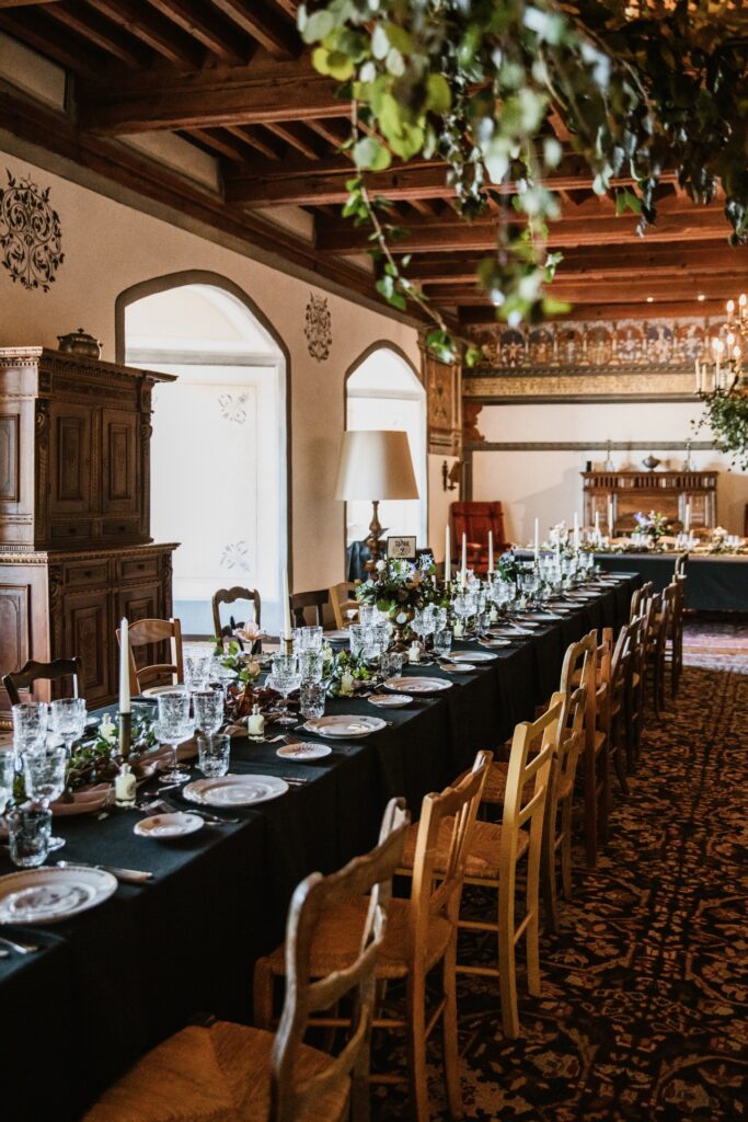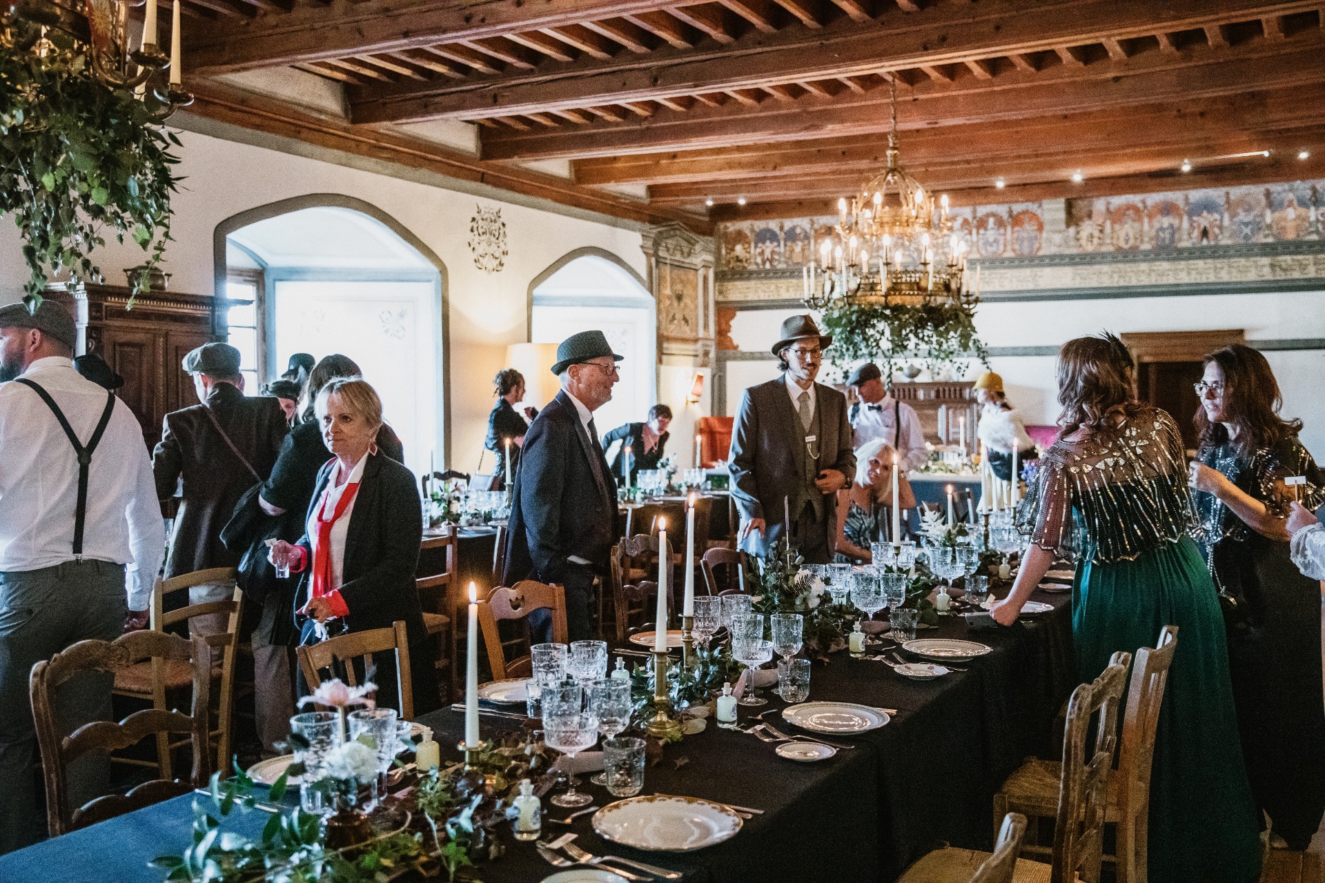 Lustre, dorures et peintures occupent déjà fortement l’espace de la salle de souper, il faut alors trouver comment habiller la salle pour la rendre festive, mais aussi respecter ce fameux thème de Mariage Peaky Blinders ! Quant à la cérémonie, cette cour intérieure du château de Lucens dans le canton de Vaud s’y prête à merveille.