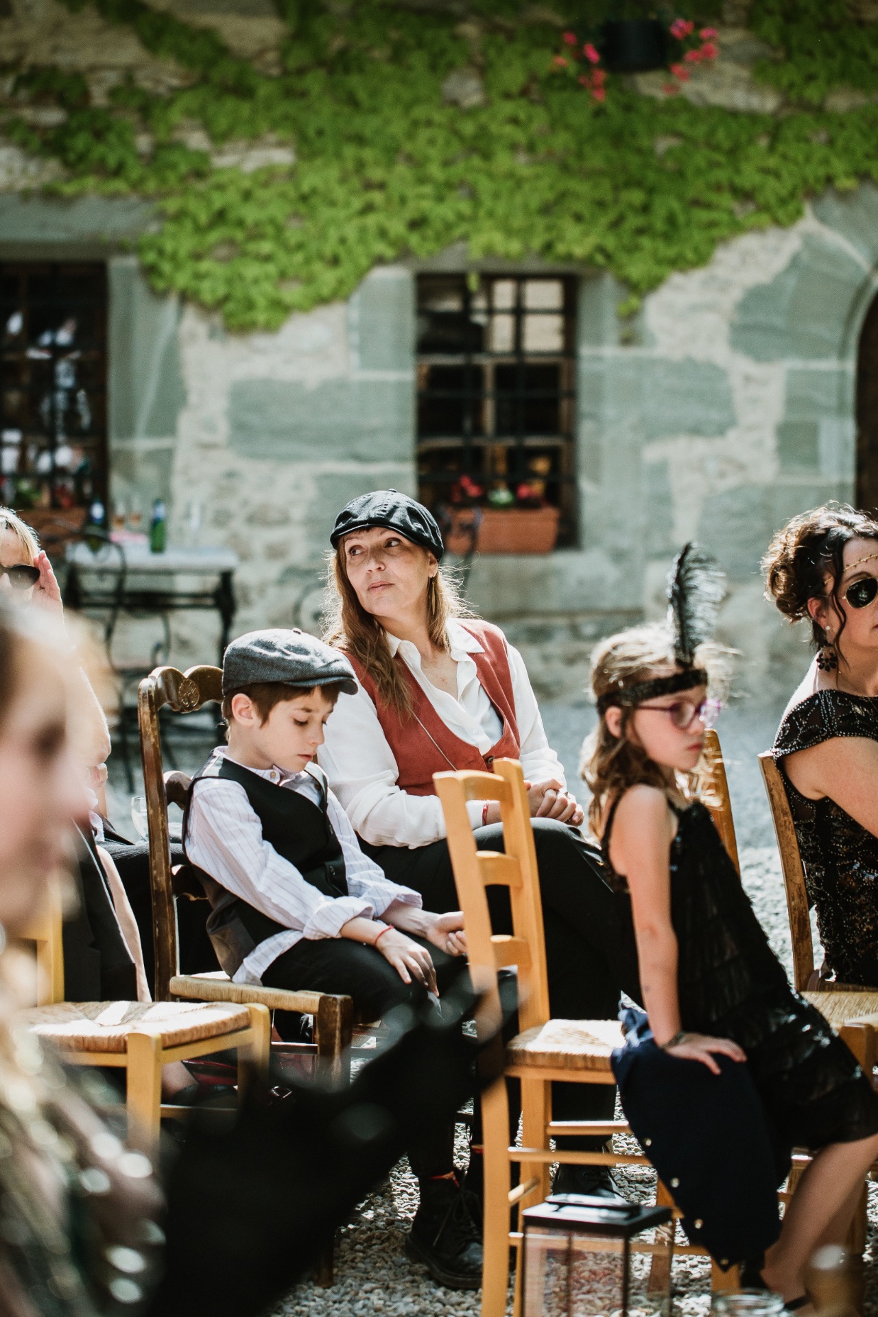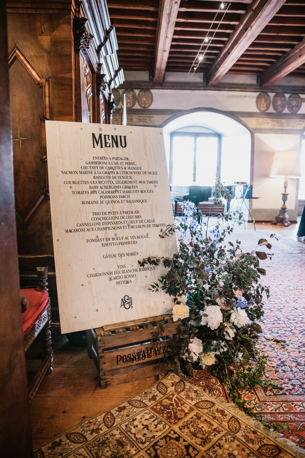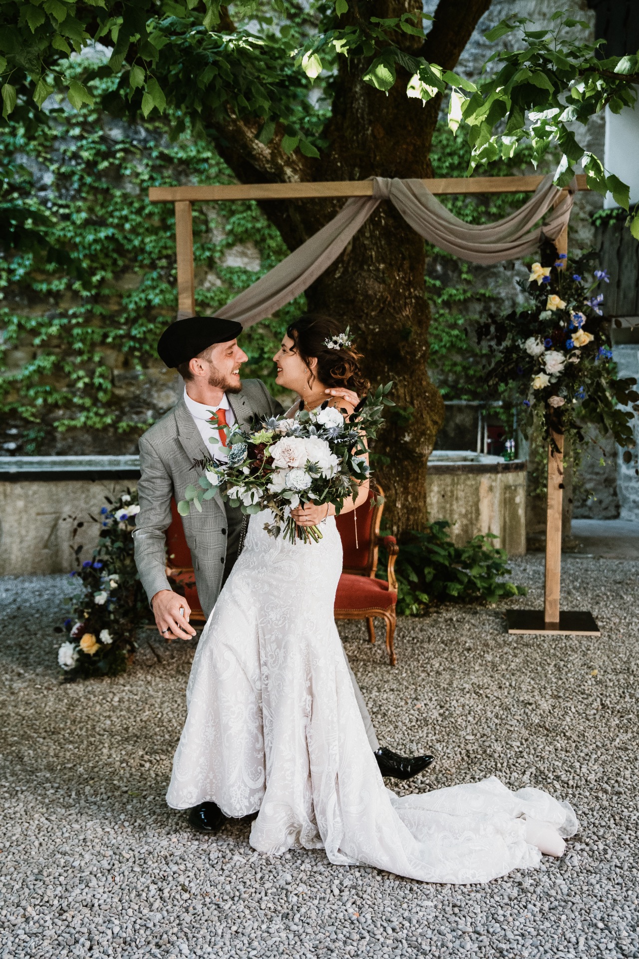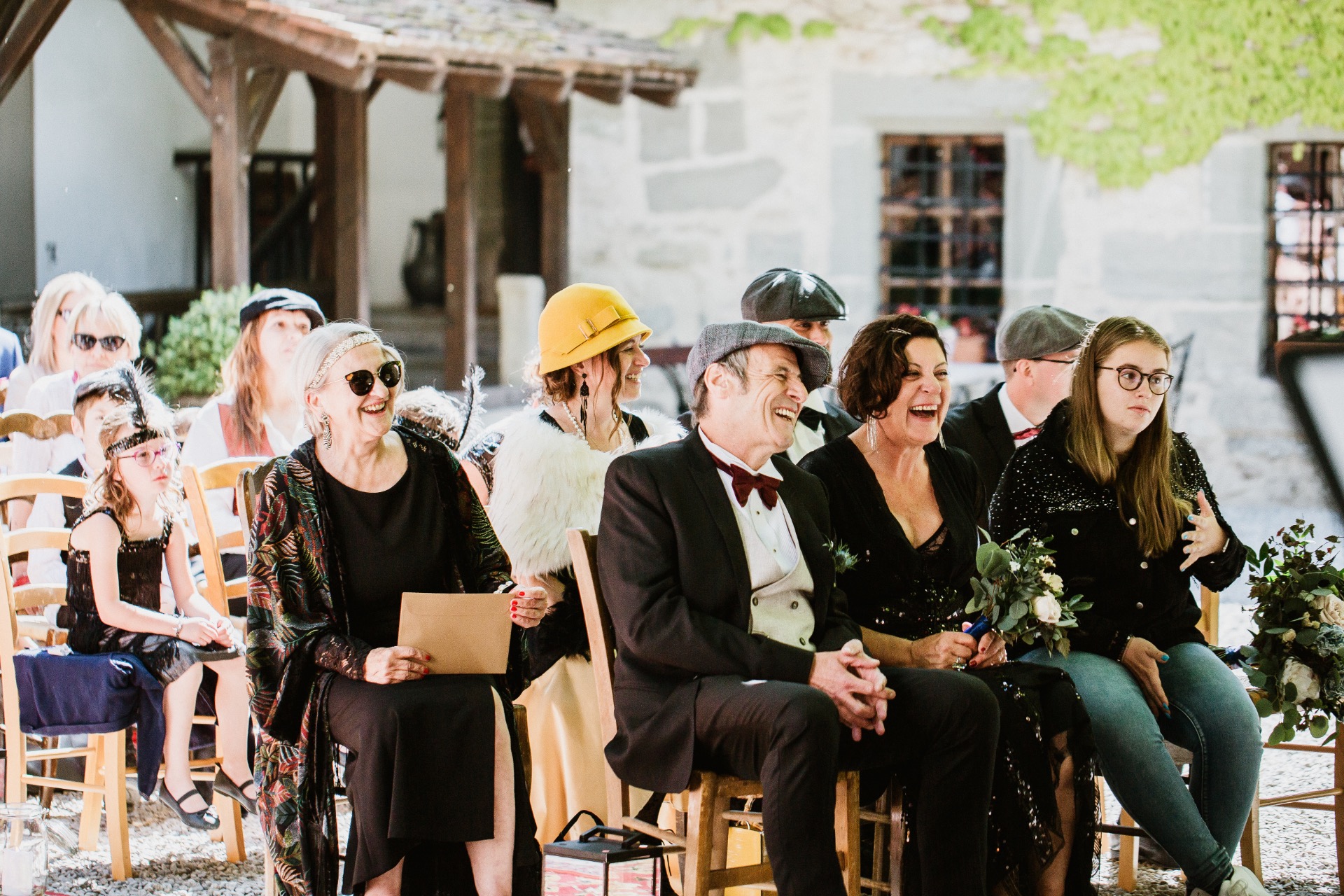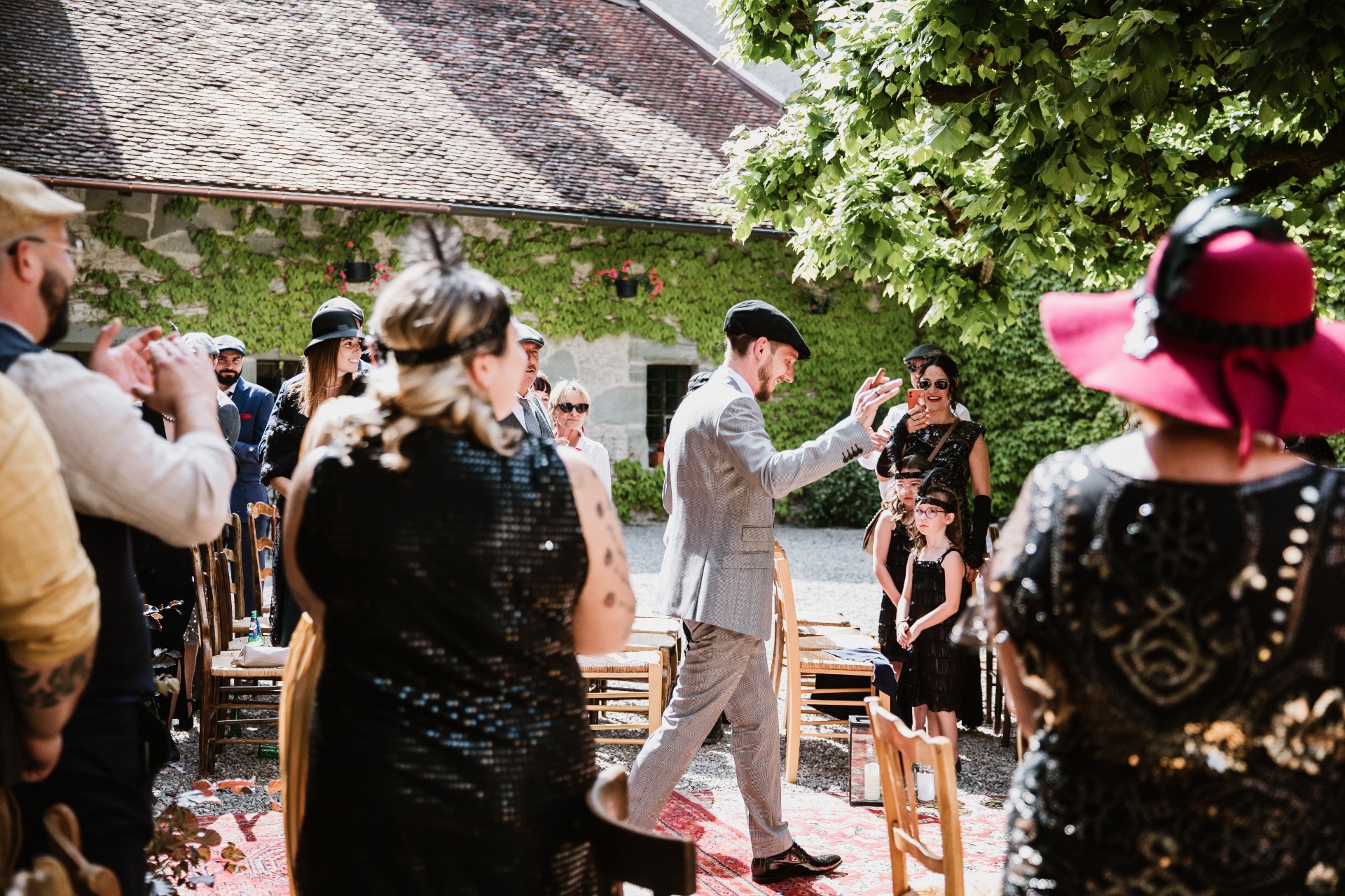 Lustre, dorures et peintures occupent déjà fortement l’espace de la salle de souper, il faut alors trouver comment habiller la salle pour la rendre festive, mais aussi respecter ce fameux thème de Mariage Peaky Blinders ! Quant à la cérémonie, cette cour intérieure du château de Lucens dans le canton de Vaud s’y prête à merveille.
