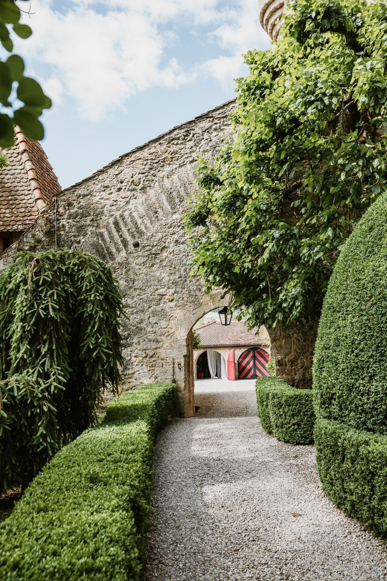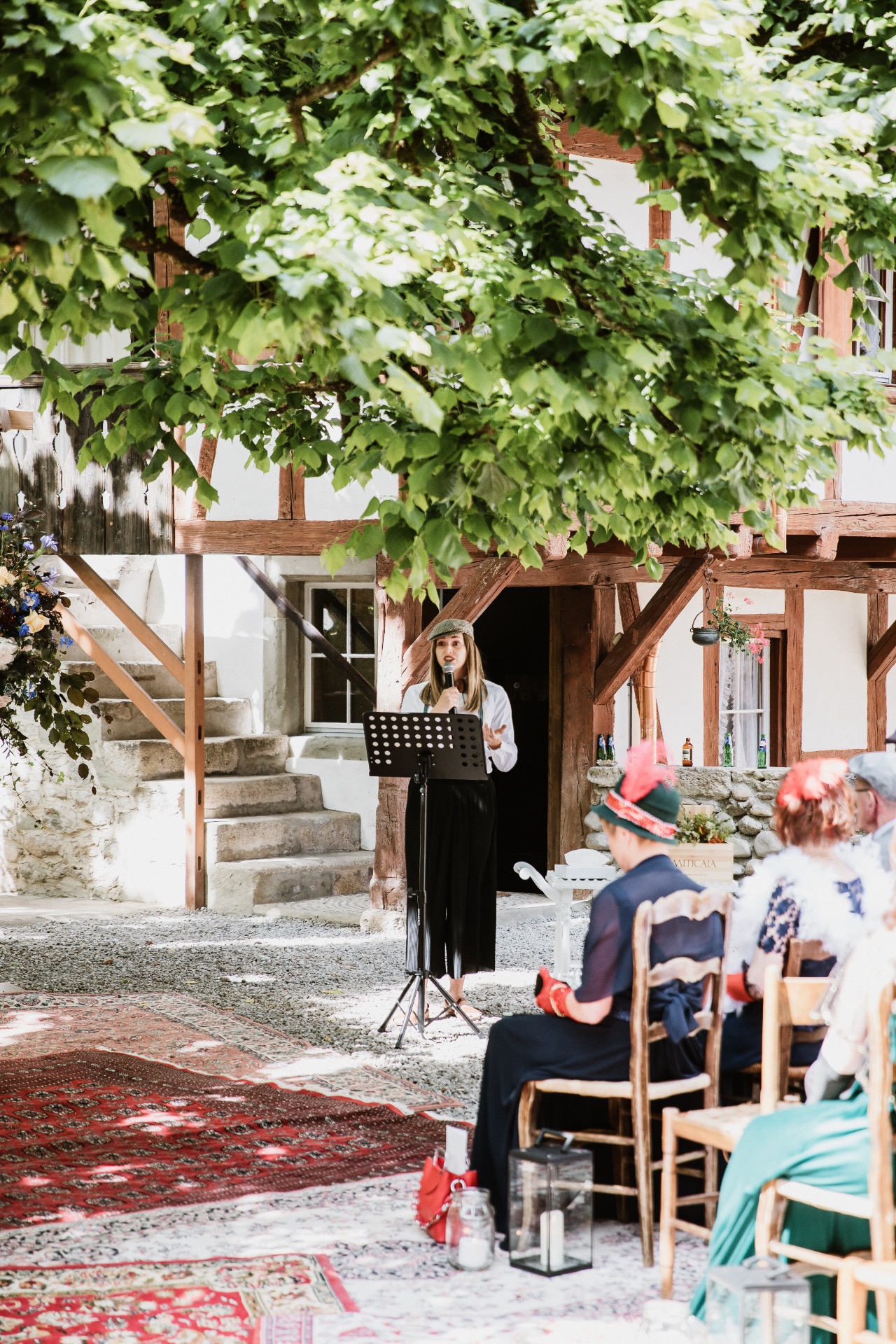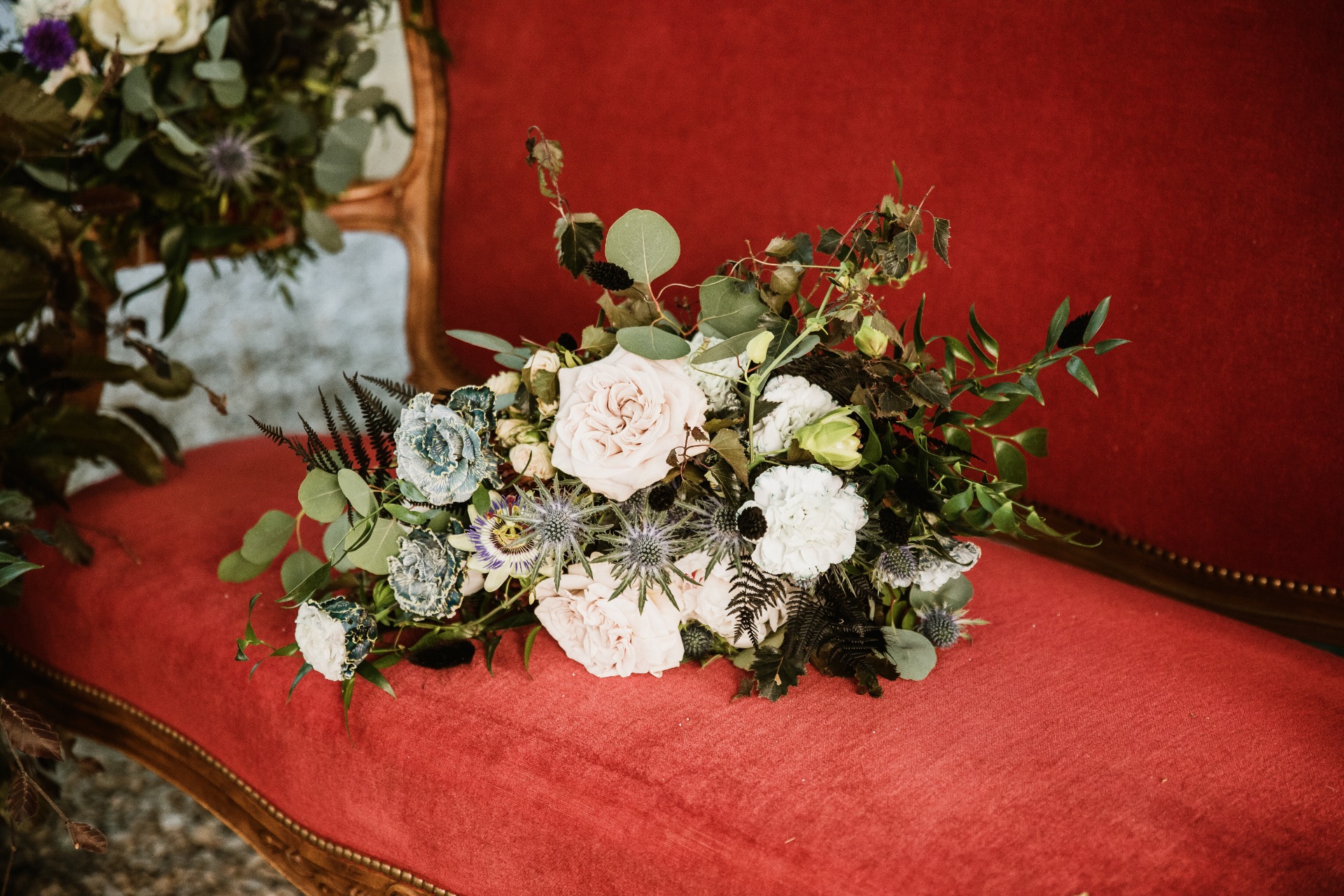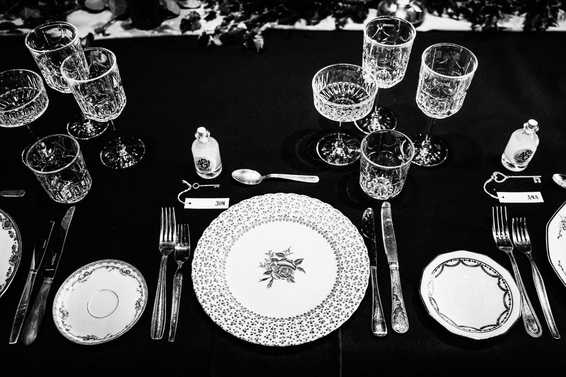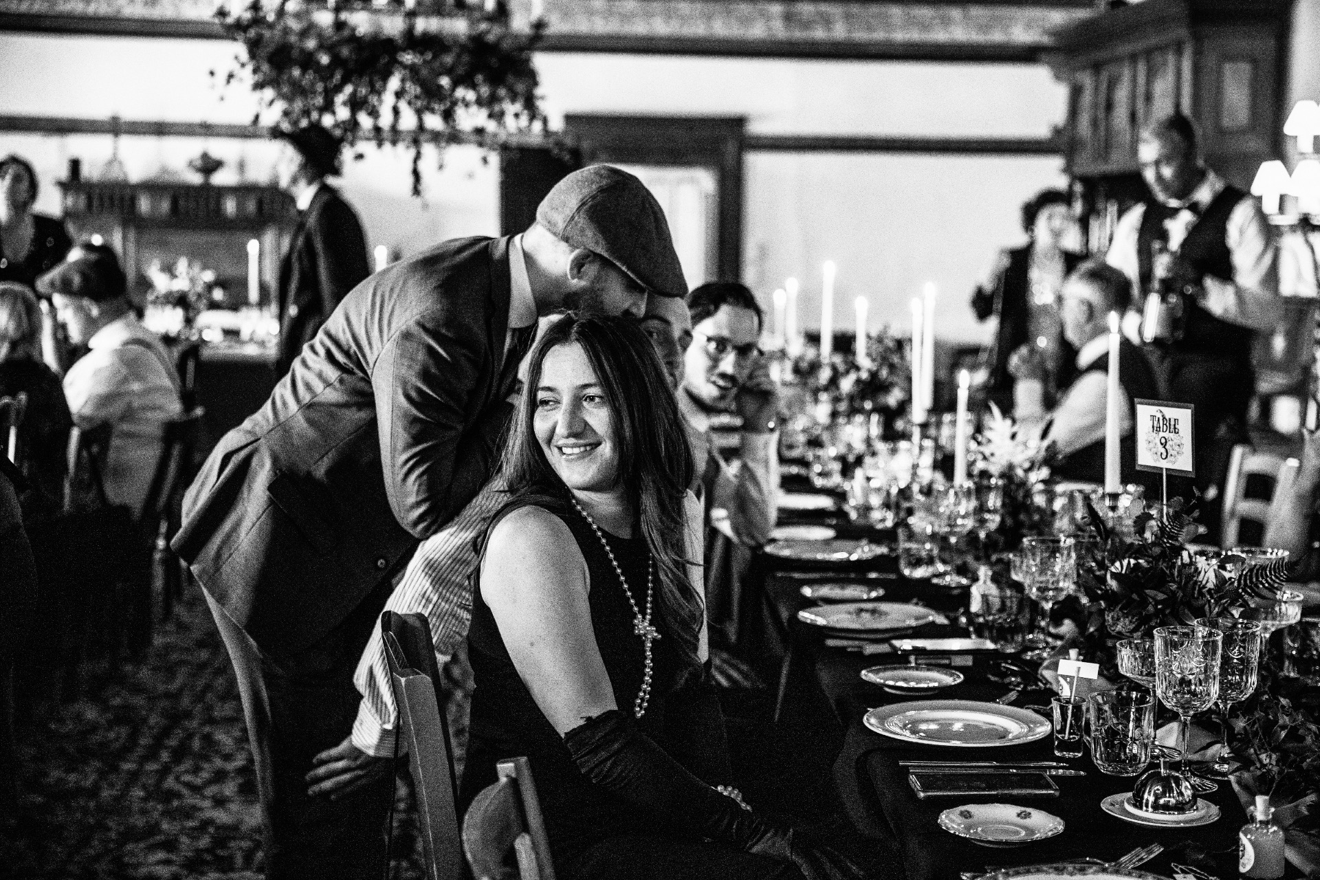 Lustre, dorures et peintures occupent déjà fortement l’espace de la salle de souper, il faut alors trouver comment habiller la salle pour la rendre festive, mais aussi respecter ce fameux thème de Mariage Peaky Blinders ! Quant à la cérémonie, cette cour intérieure du château de Lucens dans le canton de Vaud s’y prête à merveille.