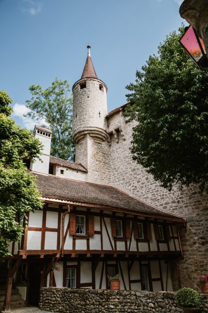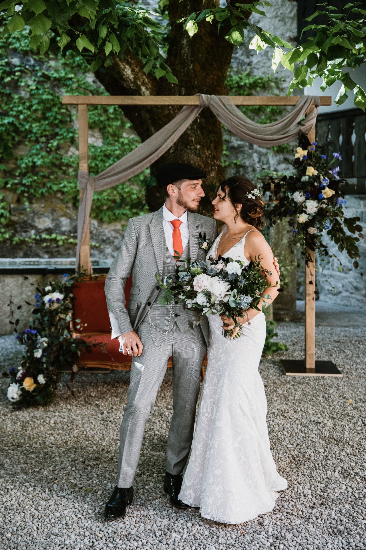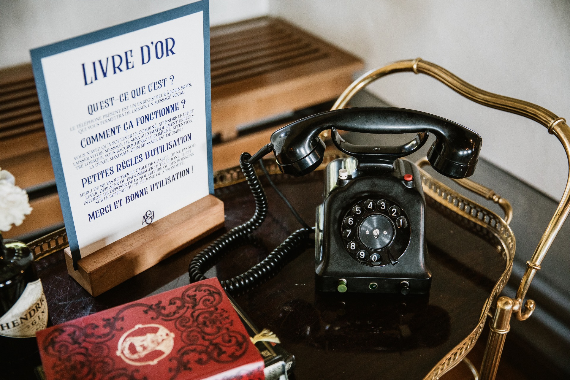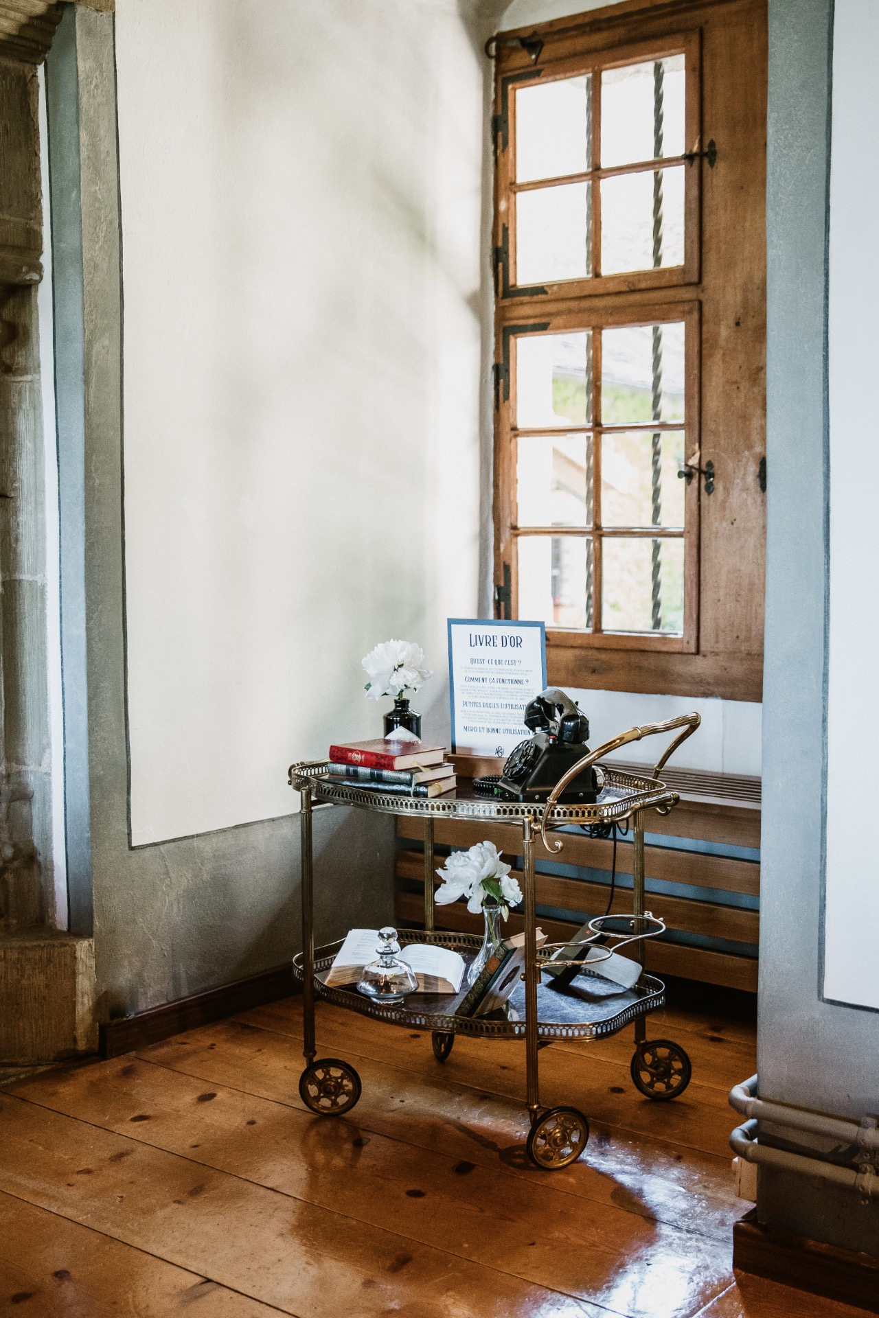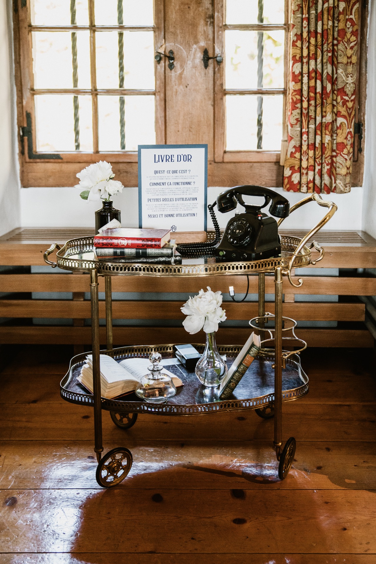 Lustre, dorures et peintures occupent déjà fortement l’espace de la salle de souper, il faut alors trouver comment habiller la salle pour la rendre festive, mais aussi respecter ce fameux thème de Mariage Peaky Blinders ! Quant à la cérémonie, cette cour intérieure du château de Lucens dans le canton de Vaud s’y prête à merveille.