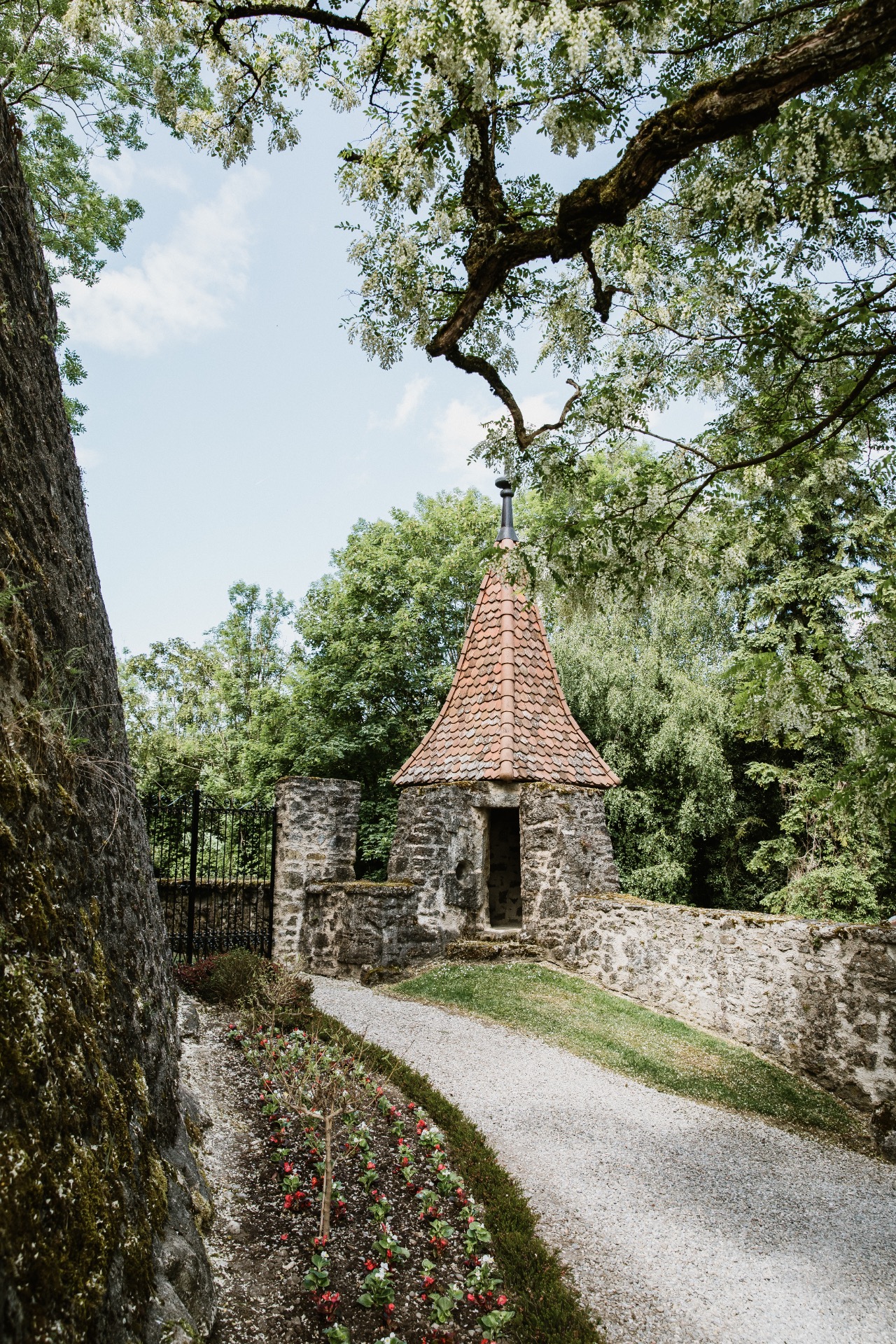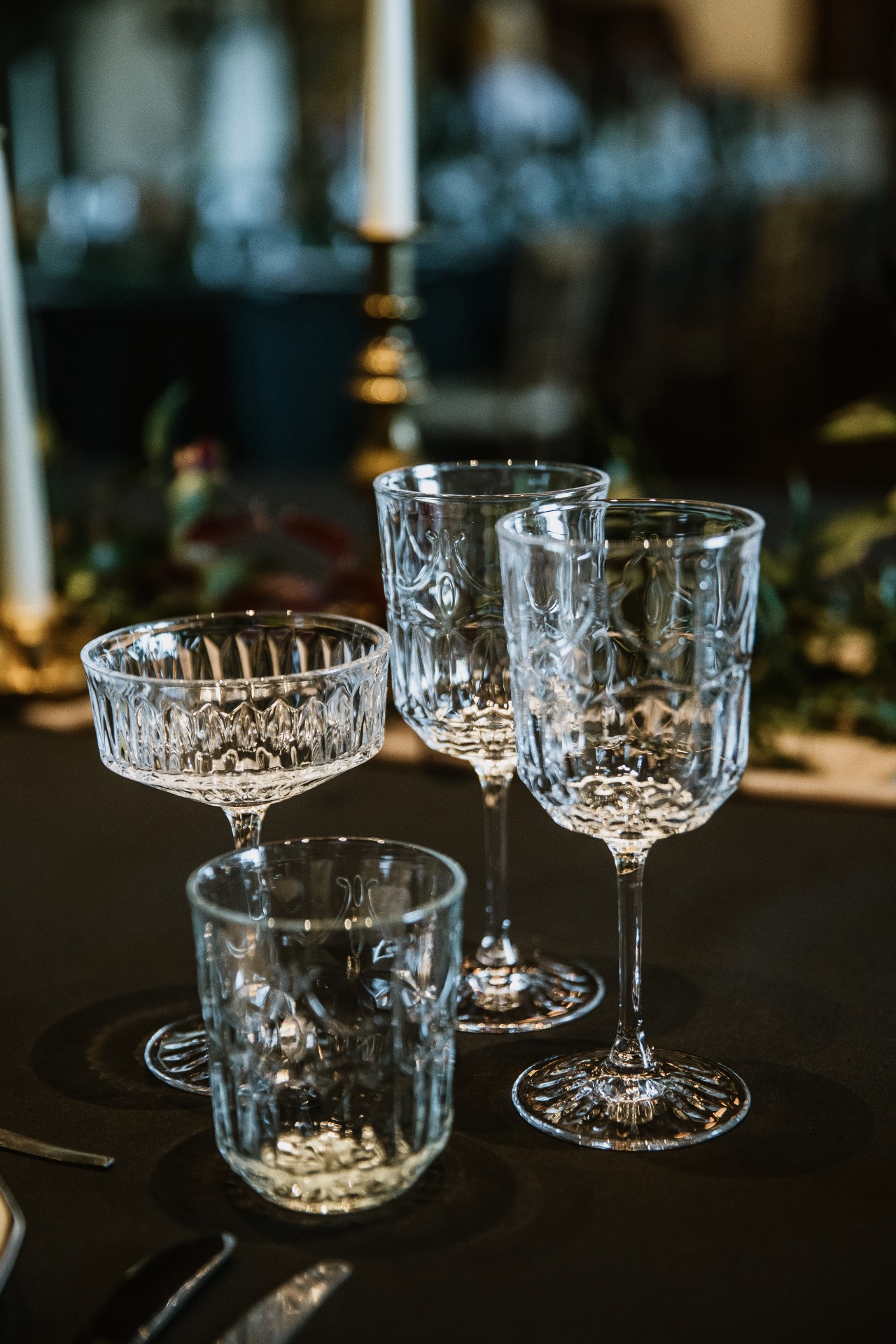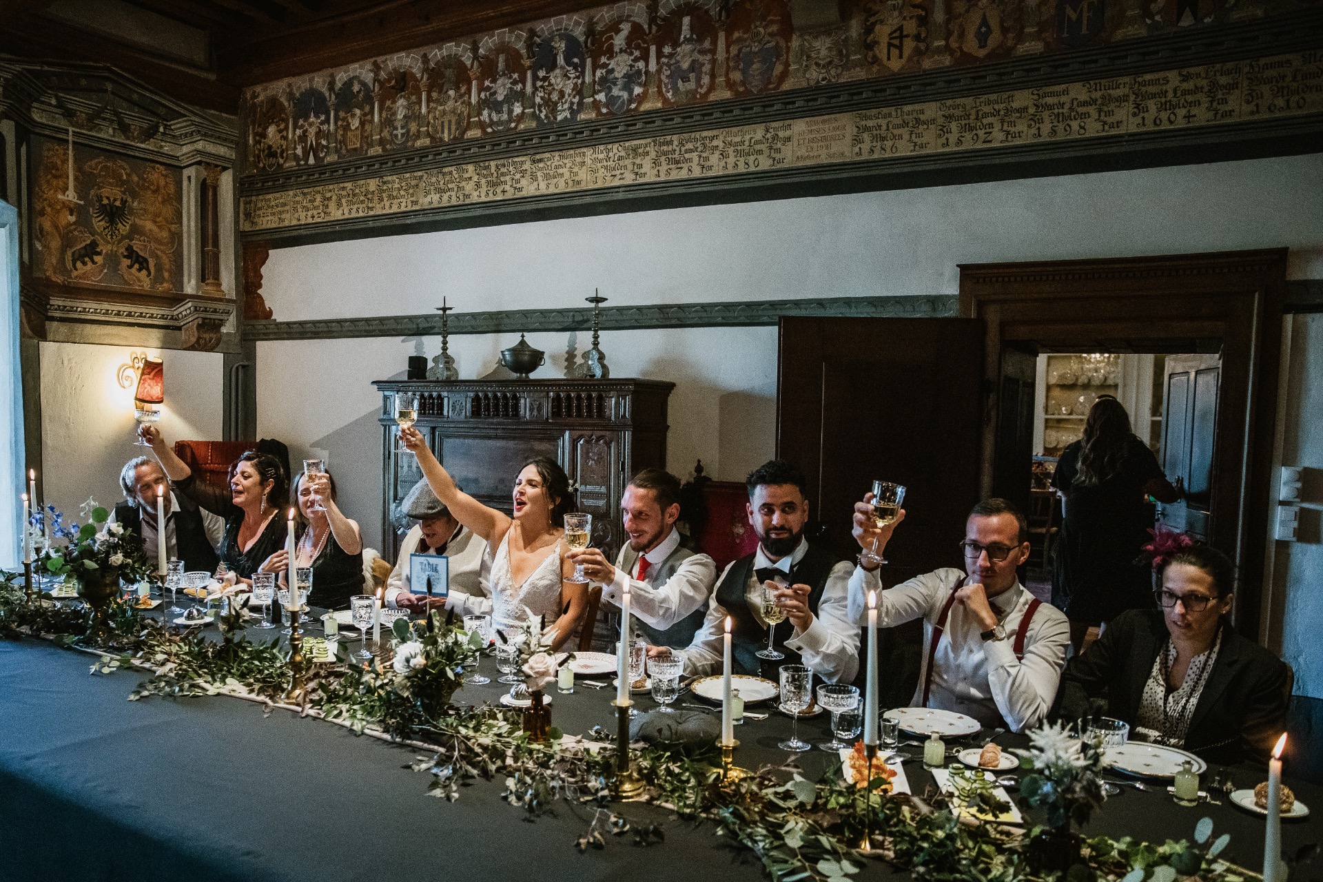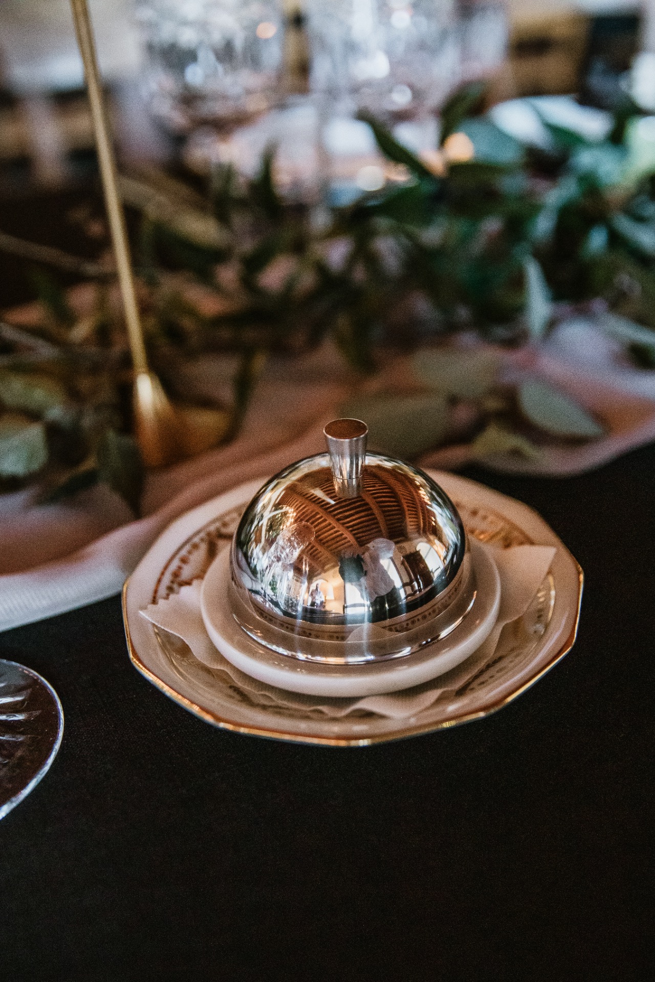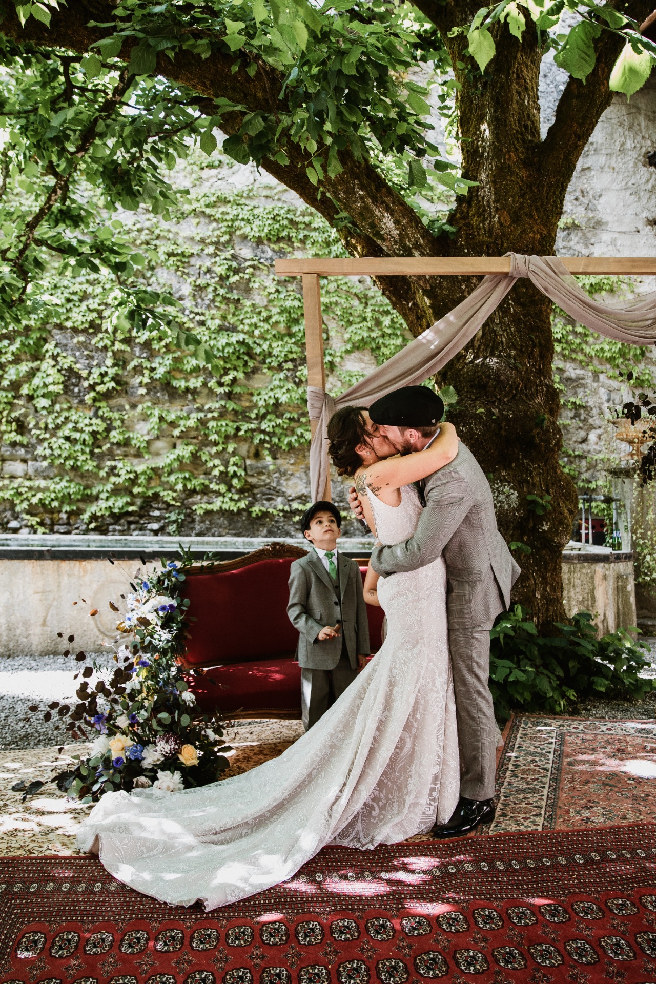 Lustre, dorures et peintures occupent déjà fortement l’espace de la salle de souper, il faut alors trouver comment habiller la salle pour la rendre festive, mais aussi respecter ce fameux thème de Mariage Peaky Blinders ! Quant à la cérémonie, cette cour intérieure du château de Lucens dans le canton de Vaud s’y prête à merveille.