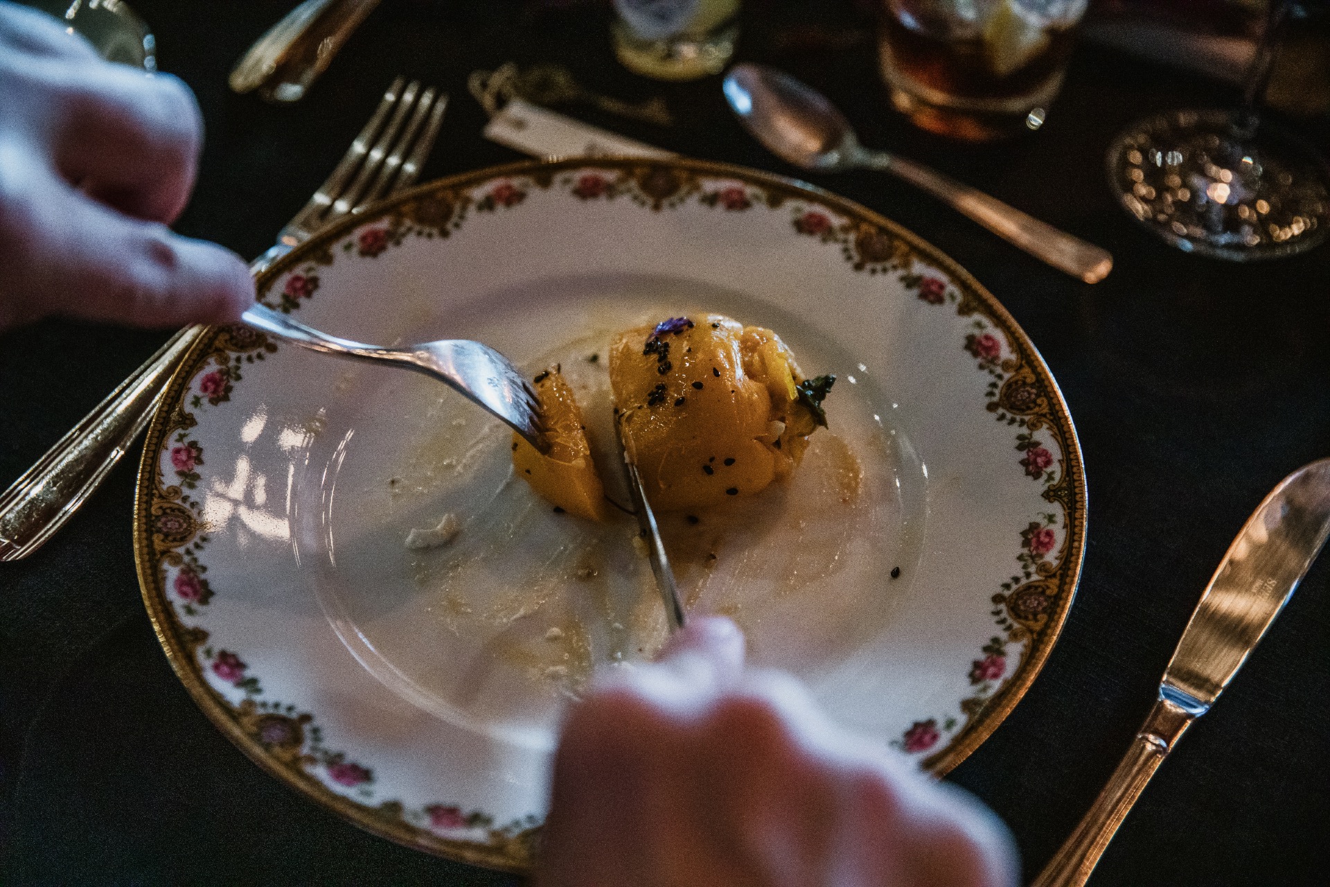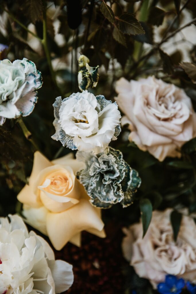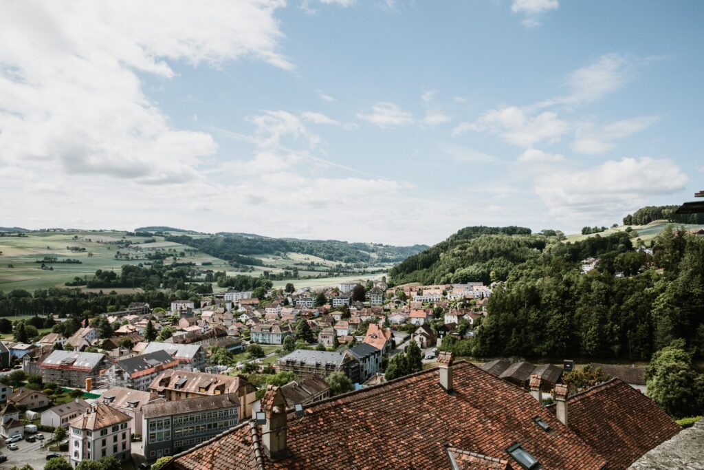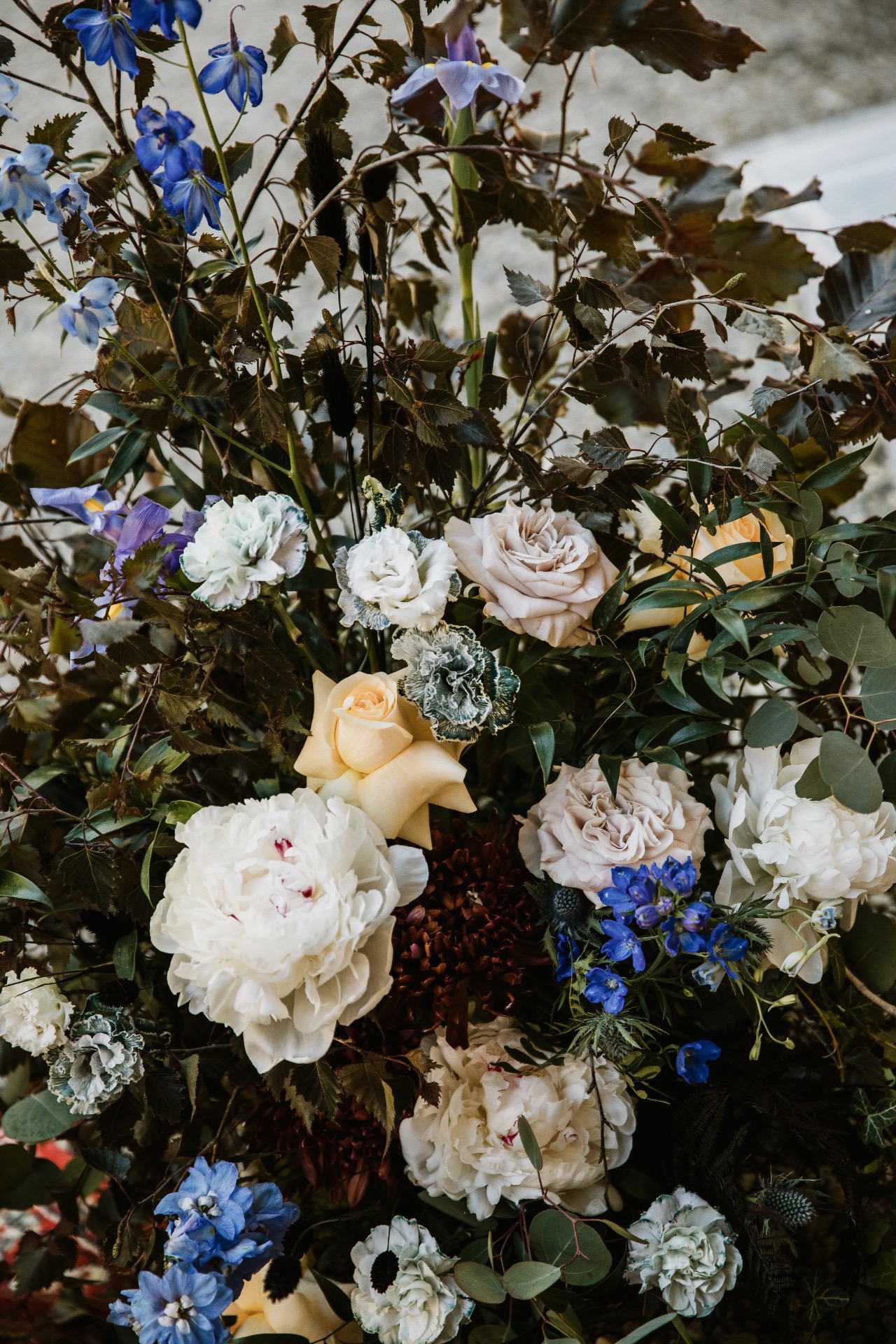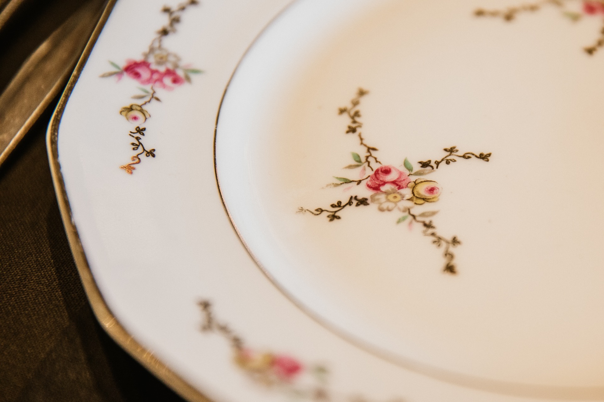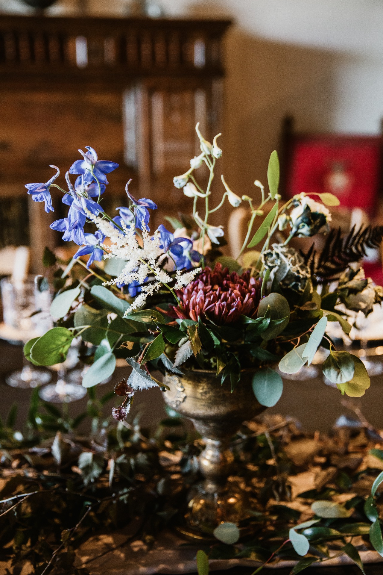 Lustre, dorures et peintures occupent déjà fortement l’espace de la salle de souper, il faut alors trouver comment habiller la salle pour la rendre festive, mais aussi respecter ce fameux thème de Mariage Peaky Blinders ! Quant à la cérémonie, cette cour intérieure du château de Lucens dans le canton de Vaud s’y prête à merveille.