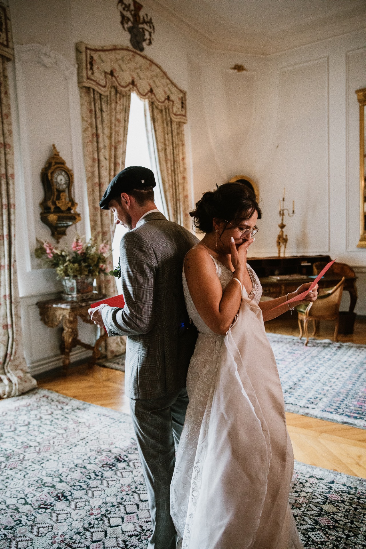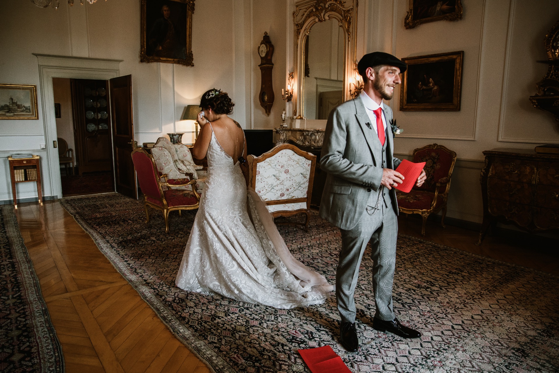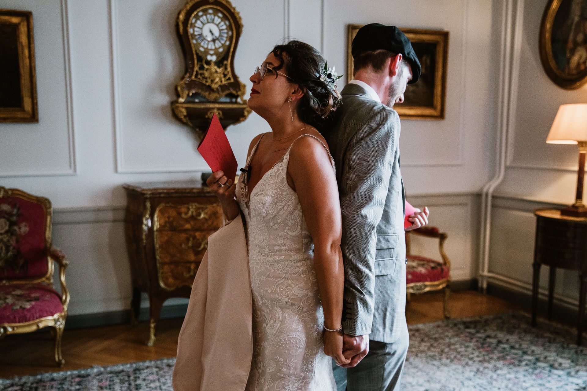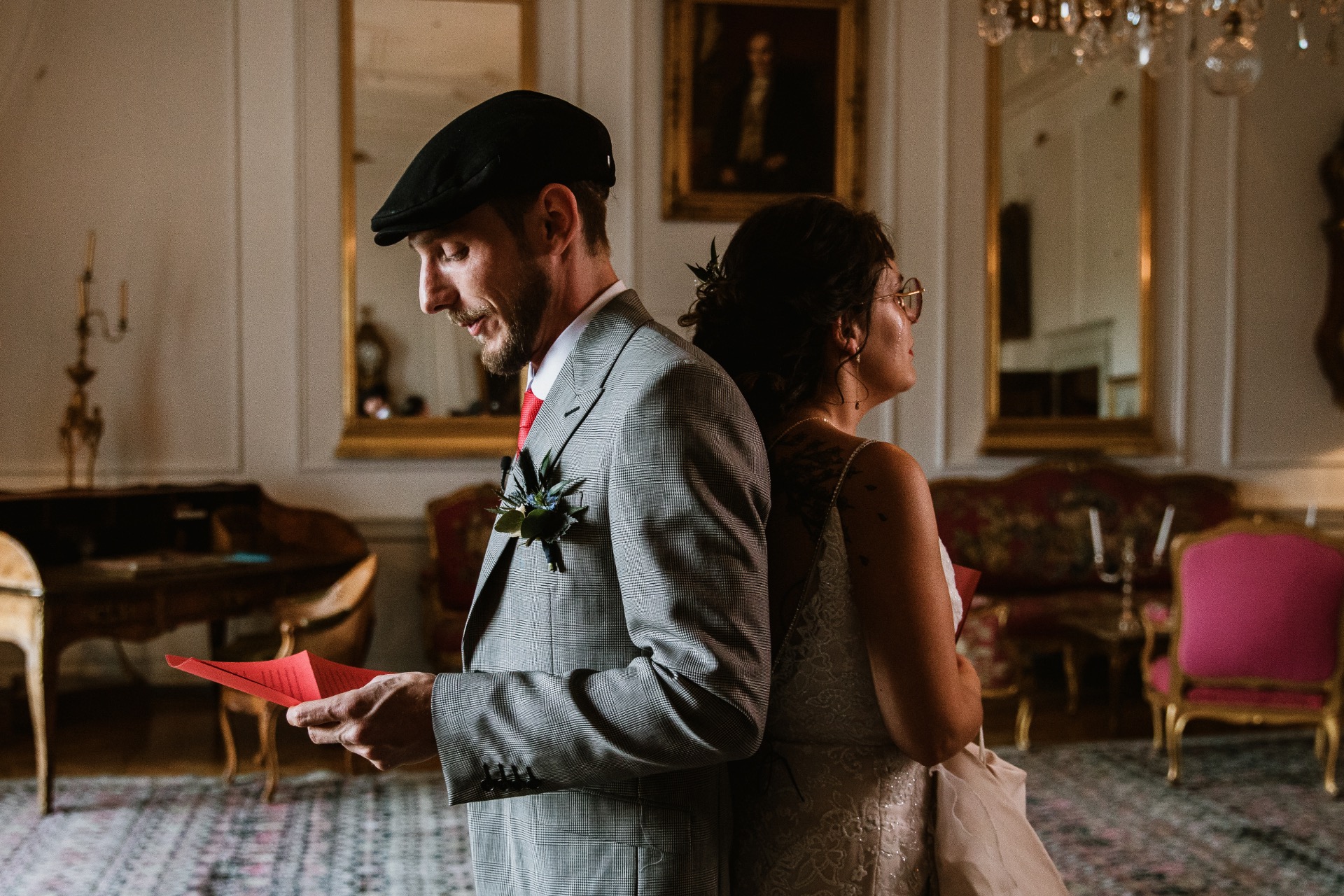Pour ce mariage décidément unique, nos amoureux ont choisi de se non-découvrir avant la cérémonie, dans l’intimité d’une des magnifiques pièces du château de Lucens. Le but était de se rejoindre, mais sans se voir, pour se lire leurs voeux de mariage dos à dos.