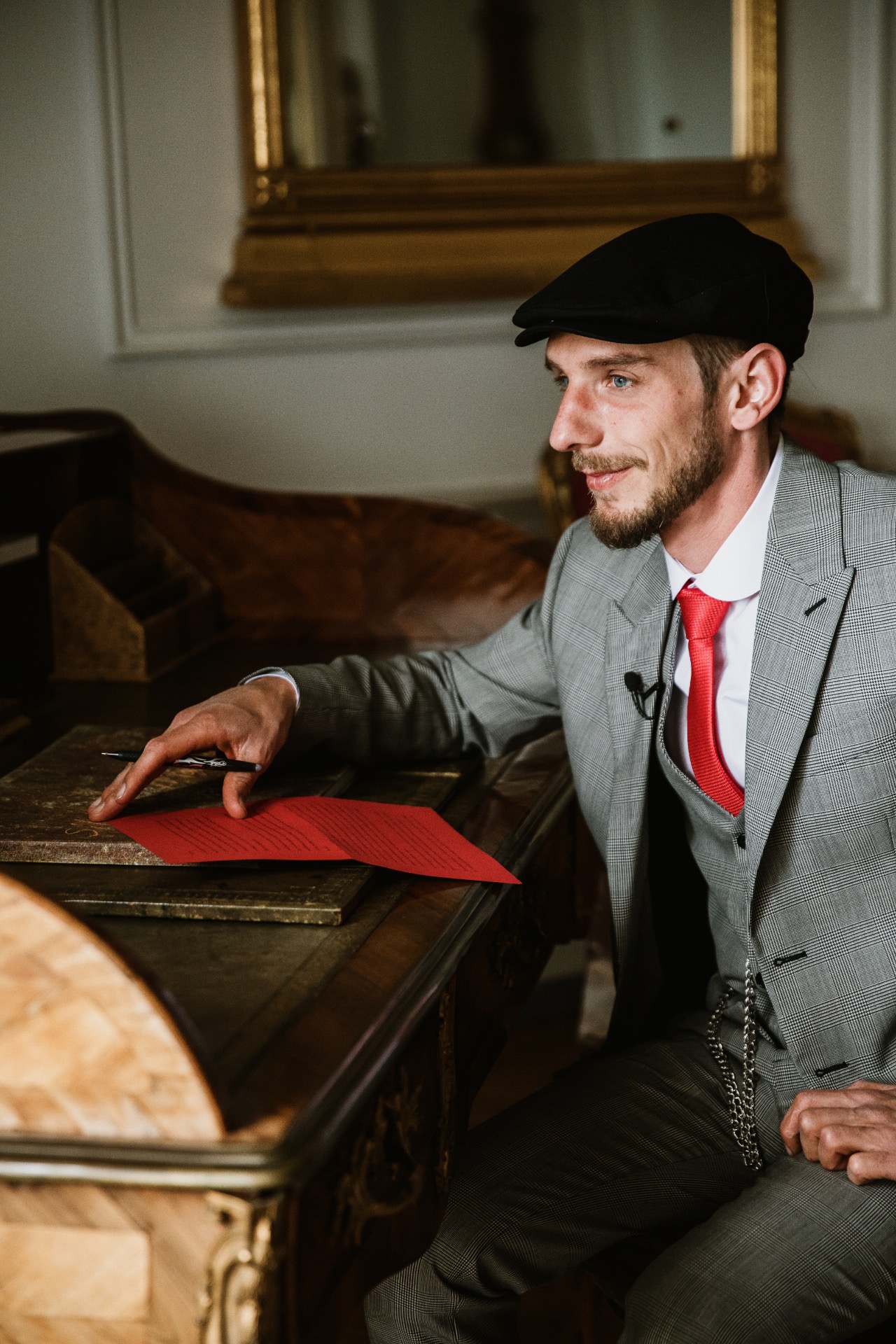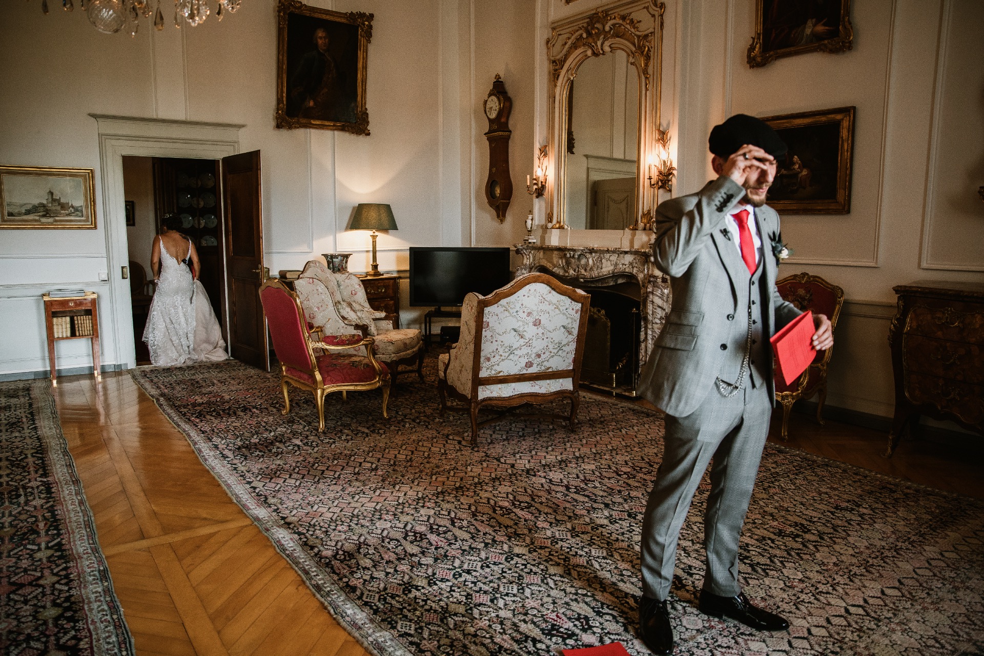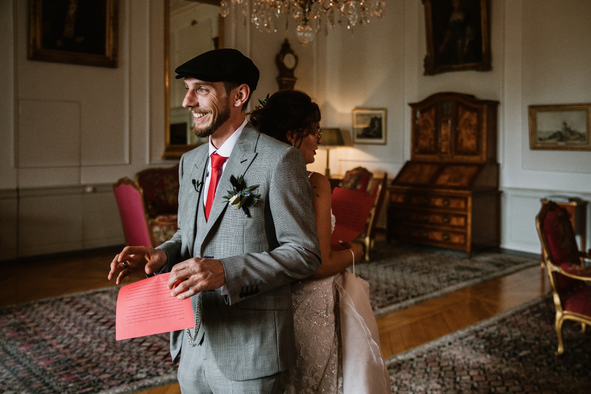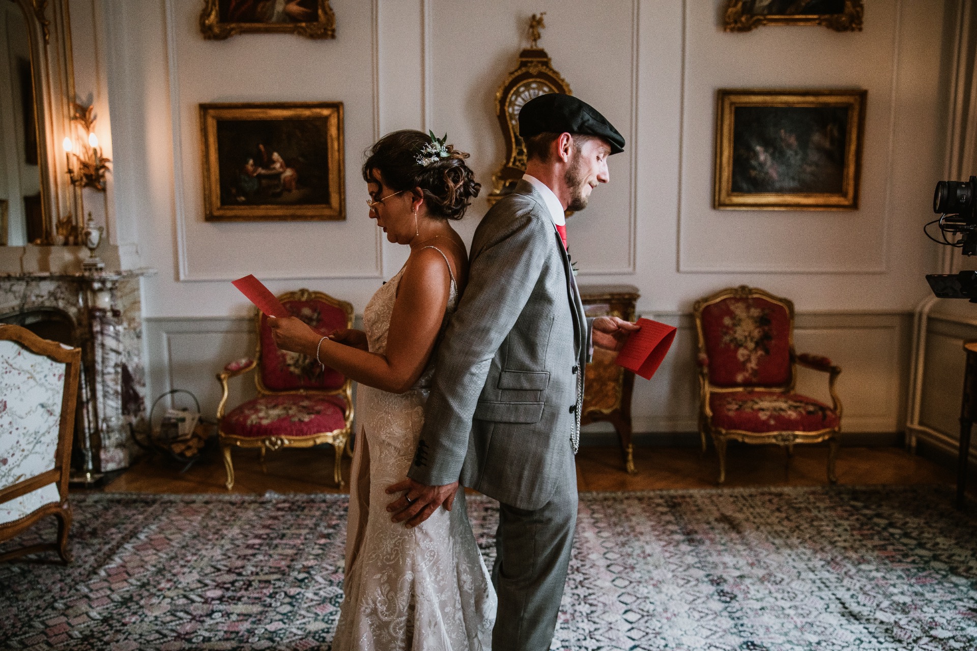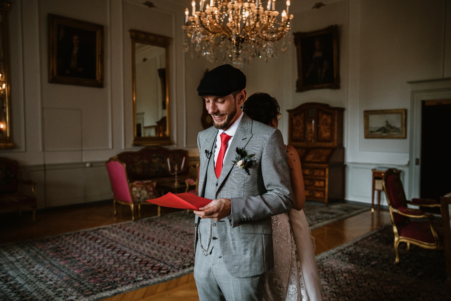 Pour ce mariage décidément unique, nos amoureux ont choisi de se non-découvrir avant la cérémonie, dans l’intimité d’une des magnifiques pièces du château de Lucens. Le but était de se rejoindre, mais sans se voir, pour se lire leurs voeux de mariage dos à dos.
