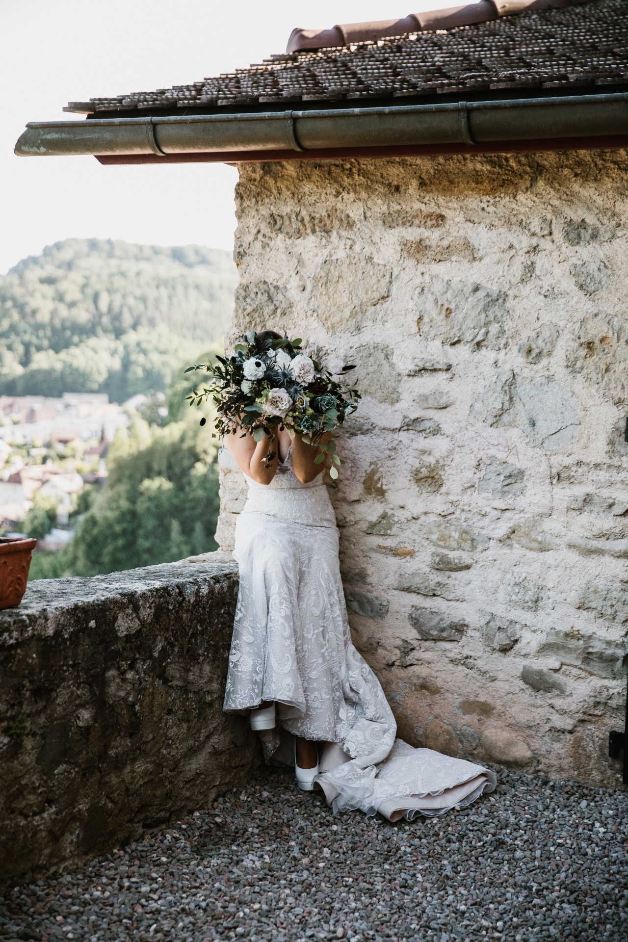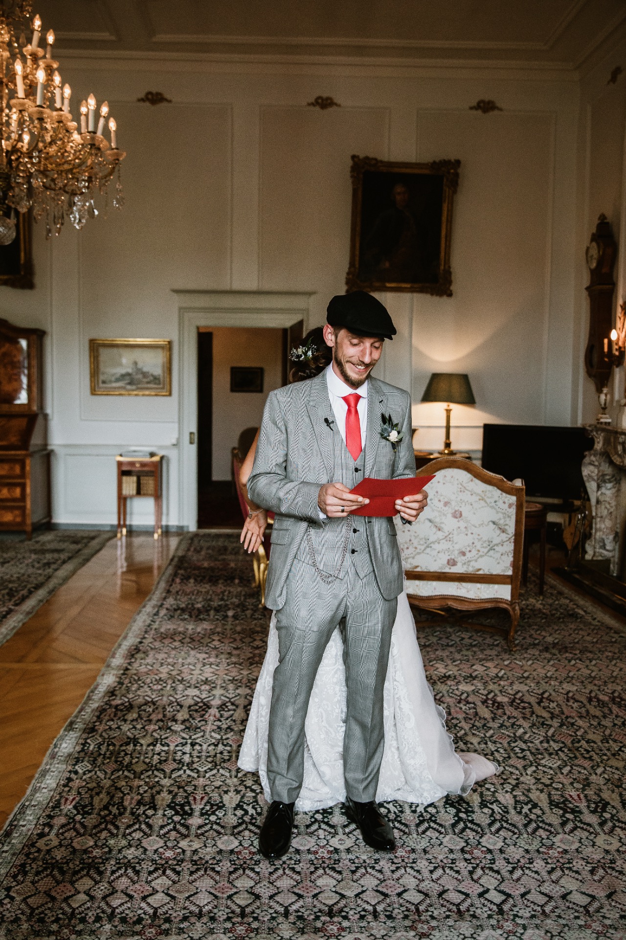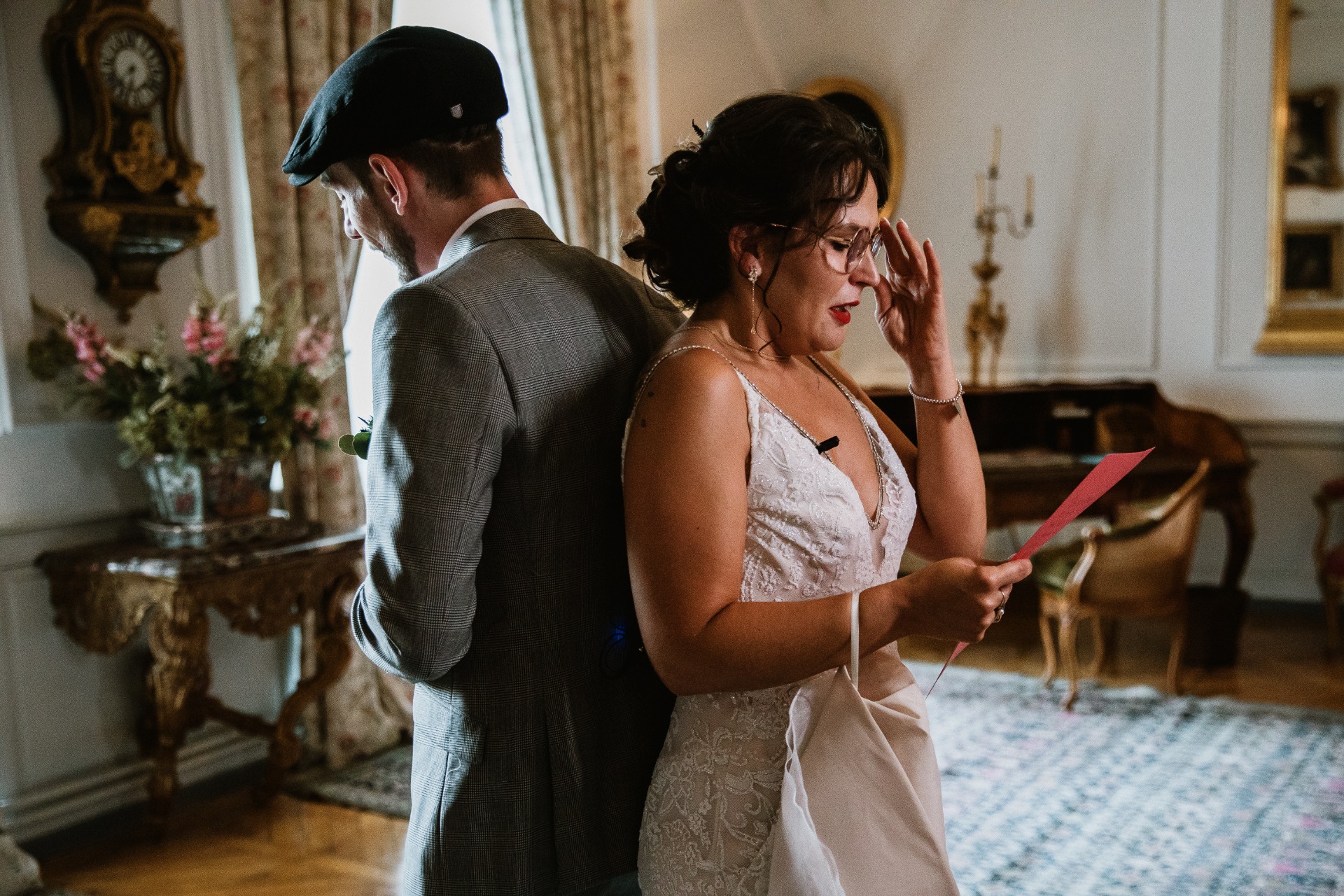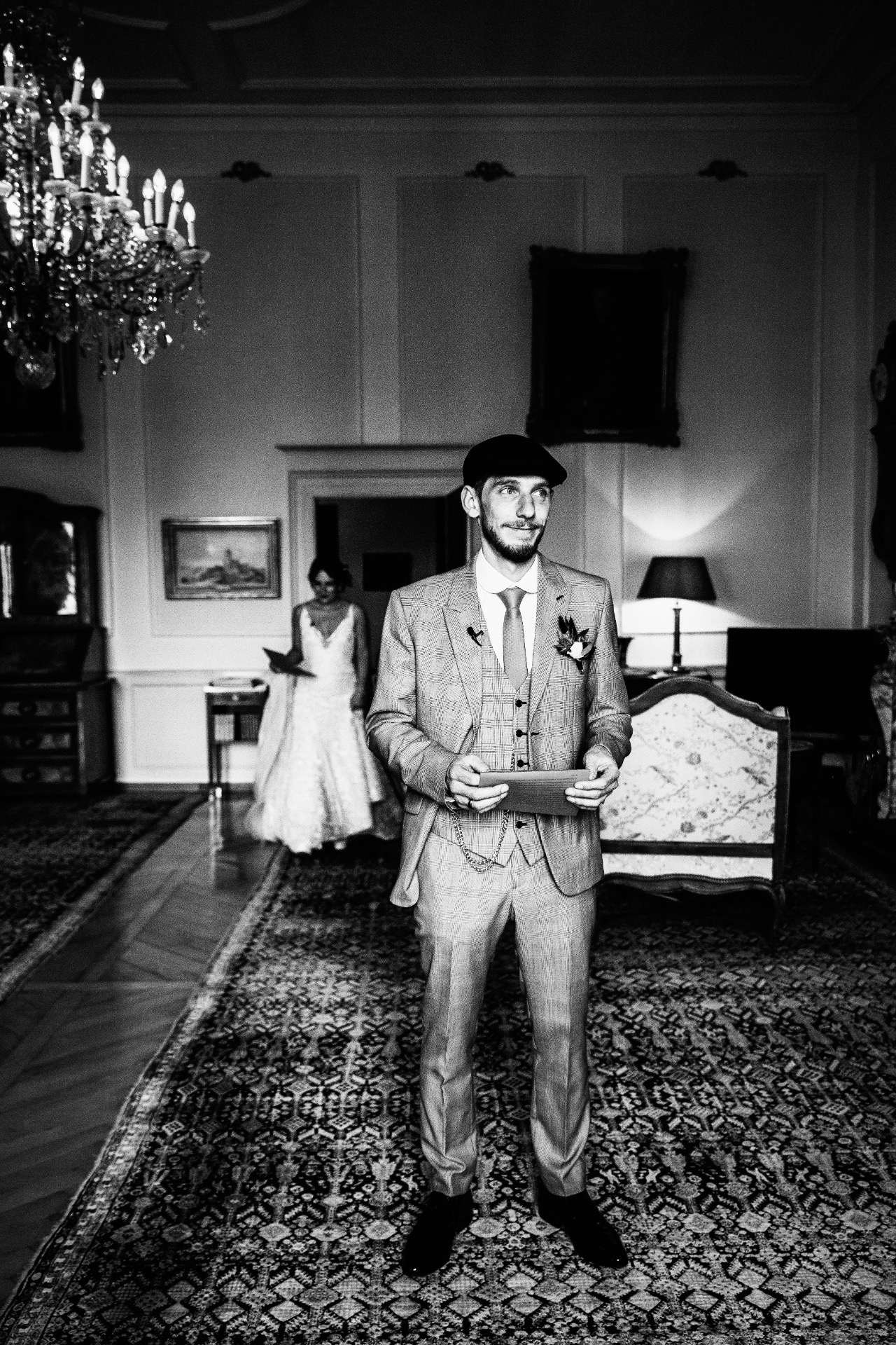 Pour ce mariage décidément unique, nos amoureux ont choisi de se non-découvrir avant la cérémonie, dans l’intimité d’une des magnifiques pièces du château de Lucens. Le but était de se rejoindre, mais sans se voir, pour se lire leurs voeux de mariage dos à dos.