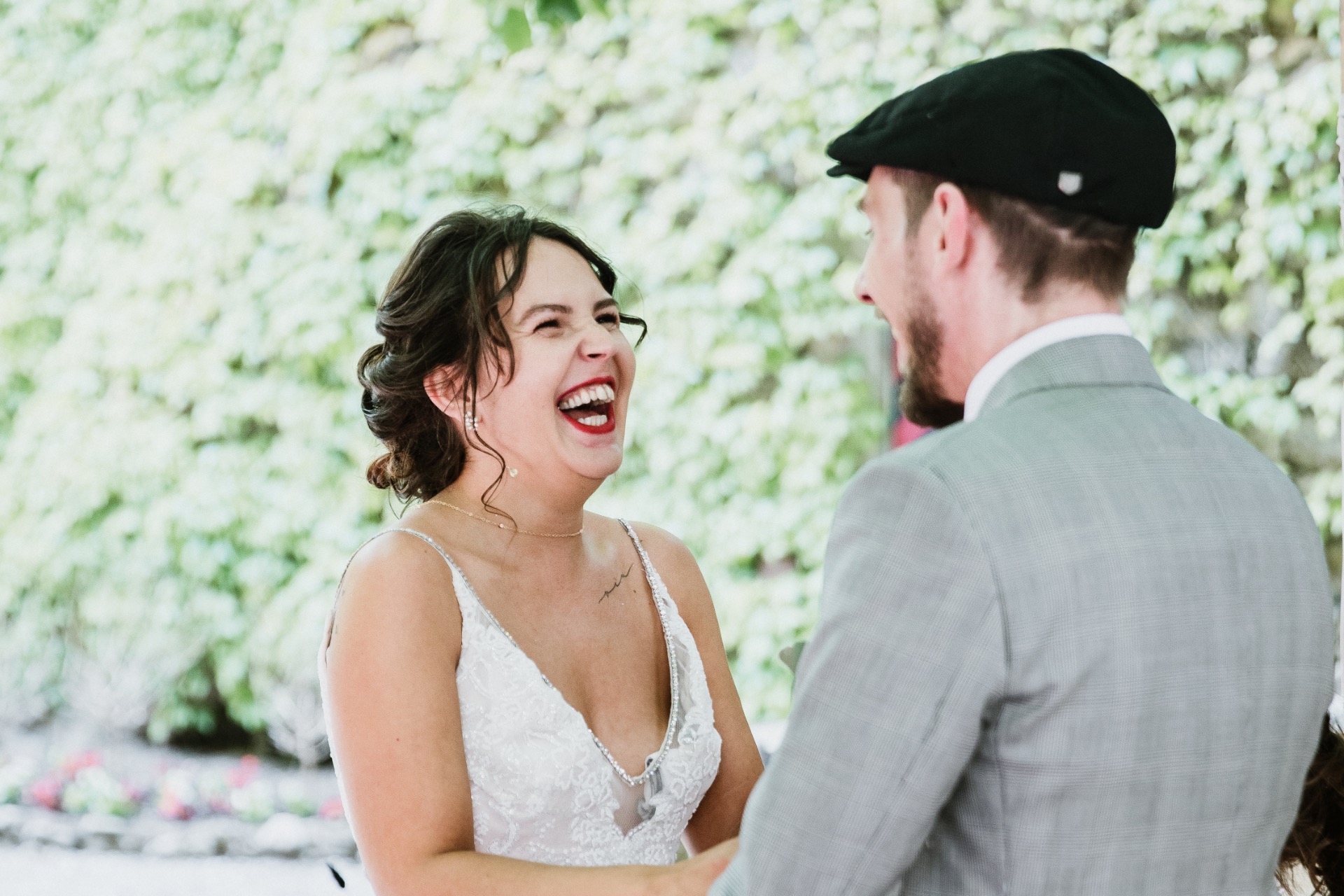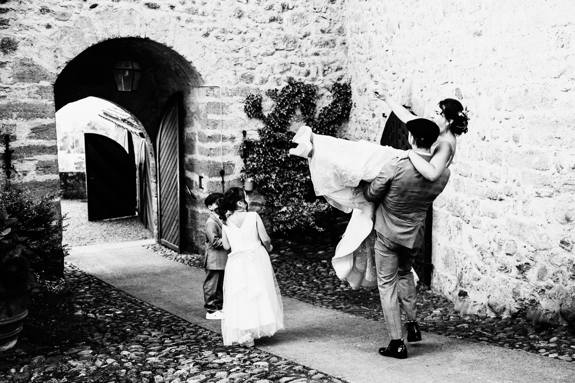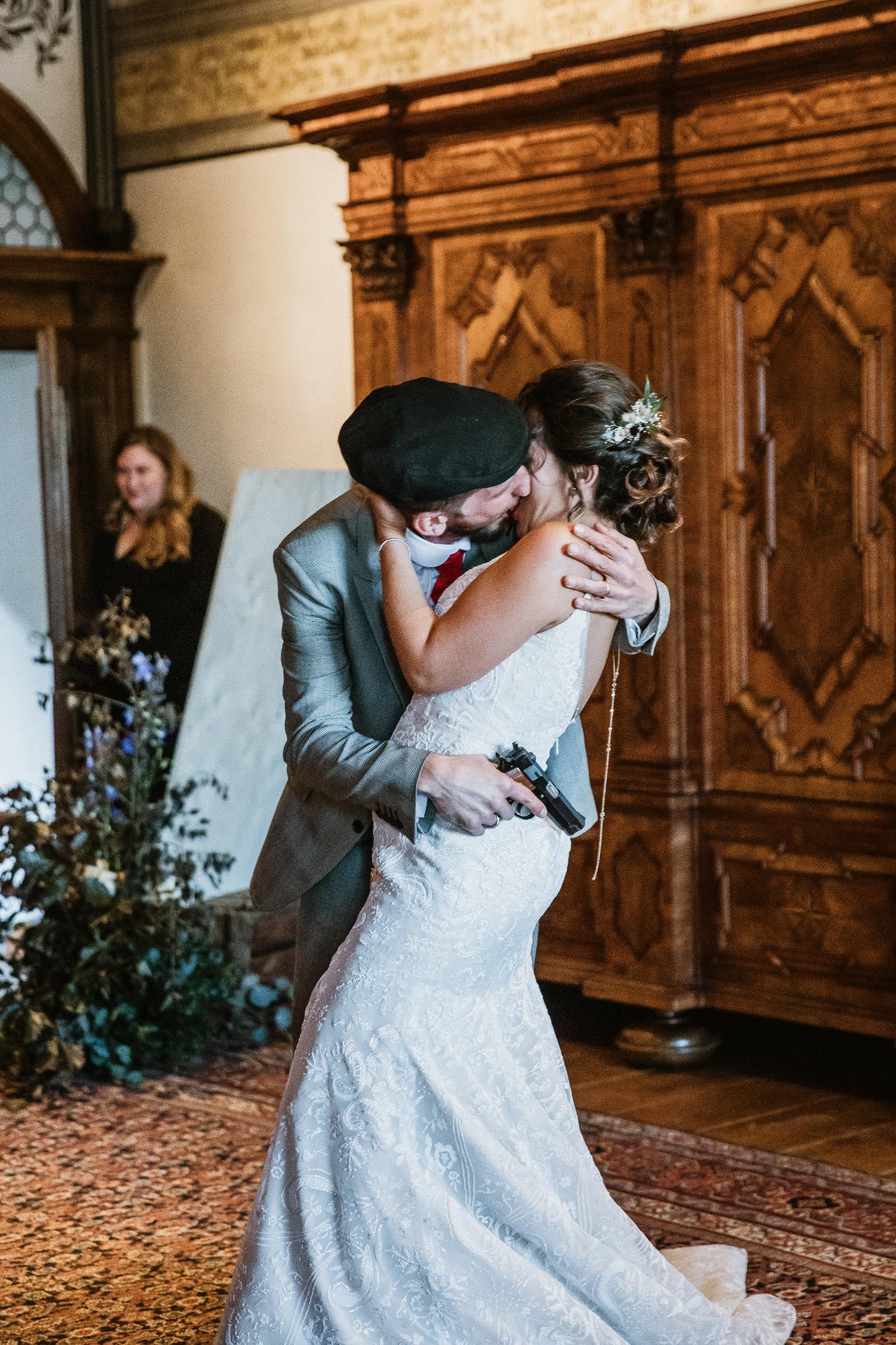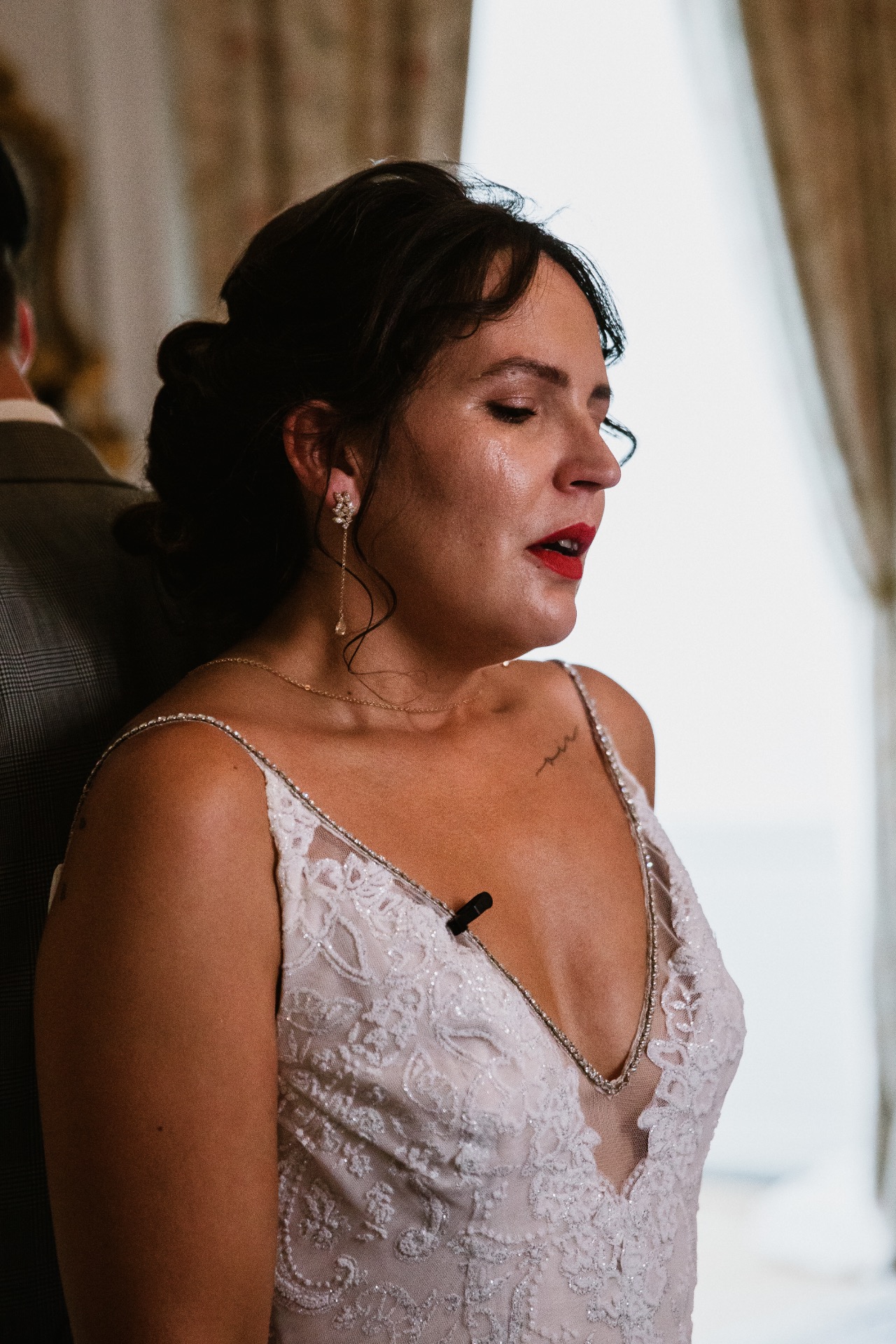 Pour ce mariage décidément unique, nos amoureux ont choisi de se non-découvrir avant la cérémonie, dans l’intimité d’une des magnifiques pièces du château de Lucens. Le but était de se rejoindre, mais sans se voir, pour se lire leurs voeux de mariage dos à dos.