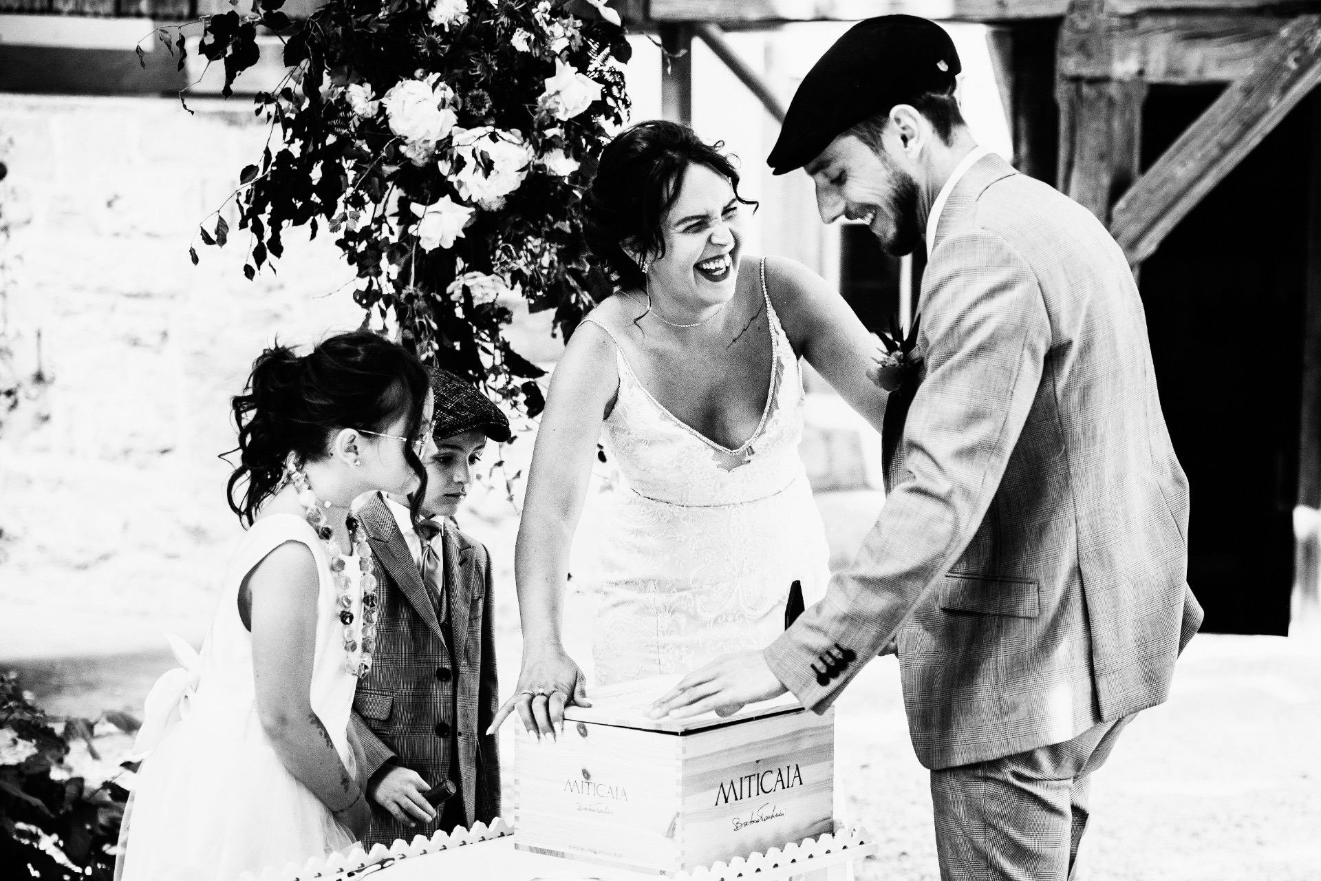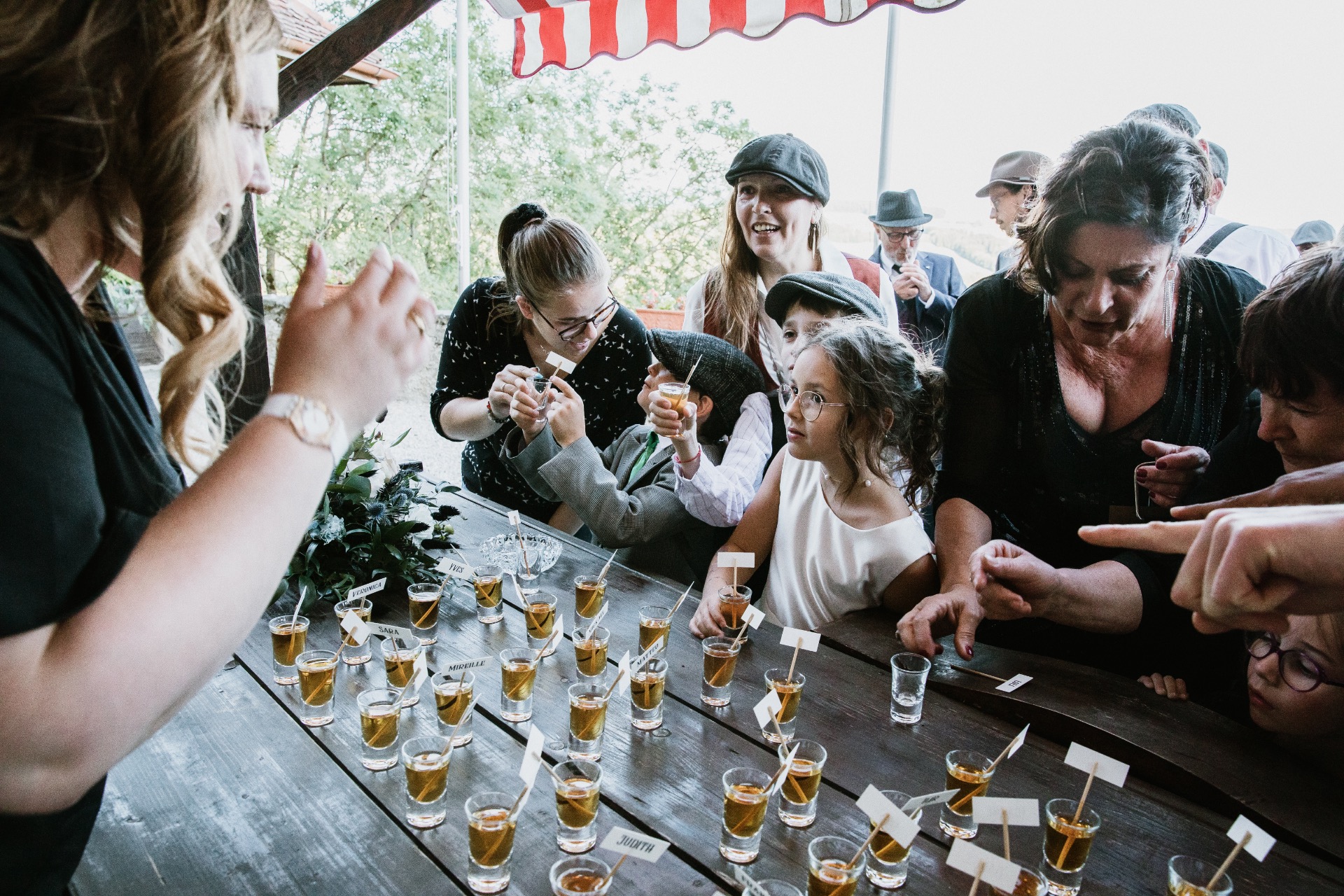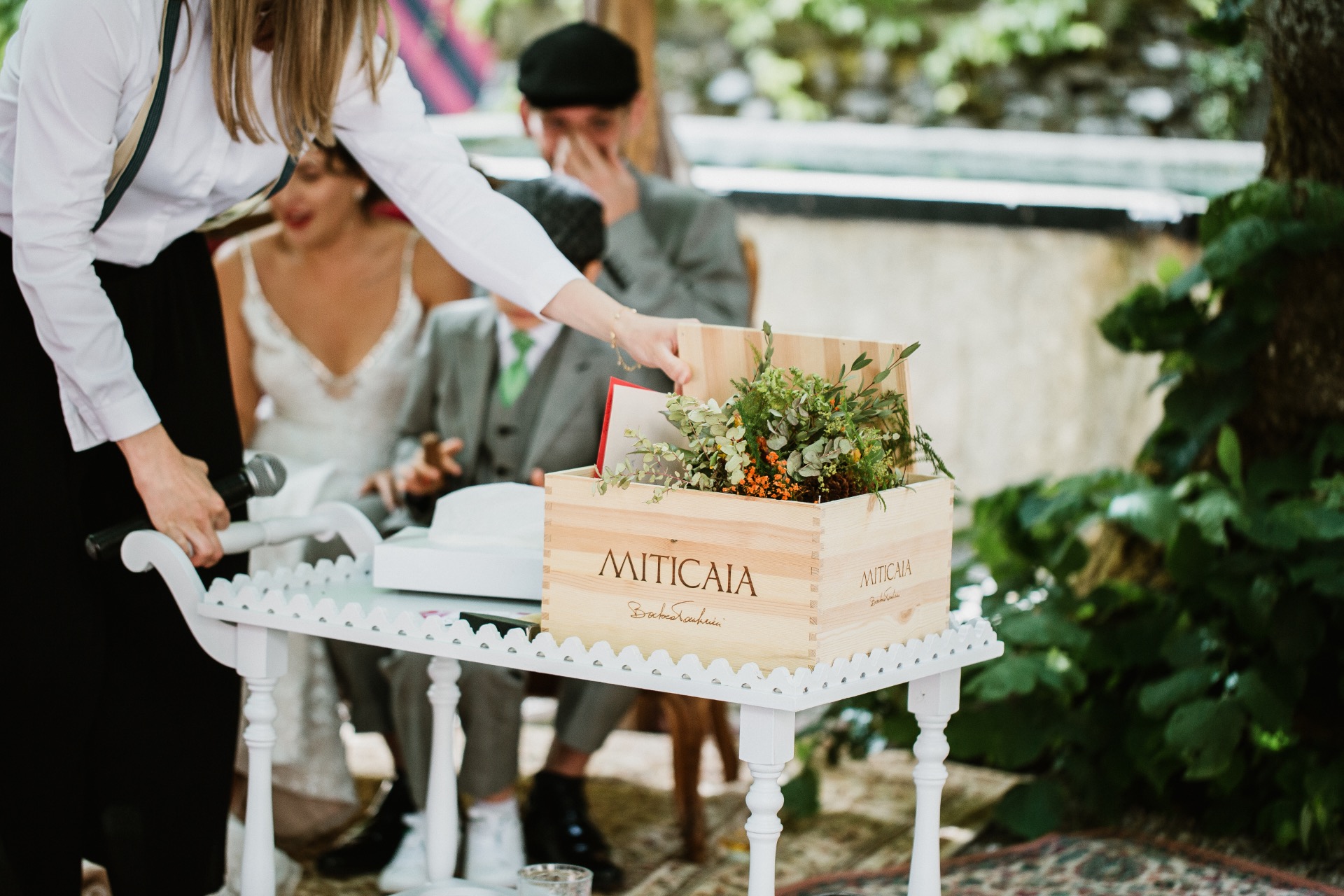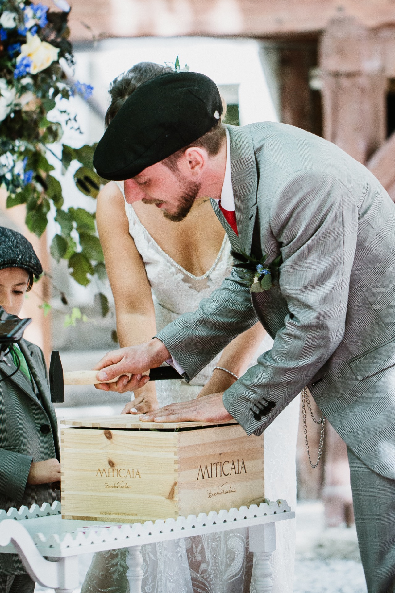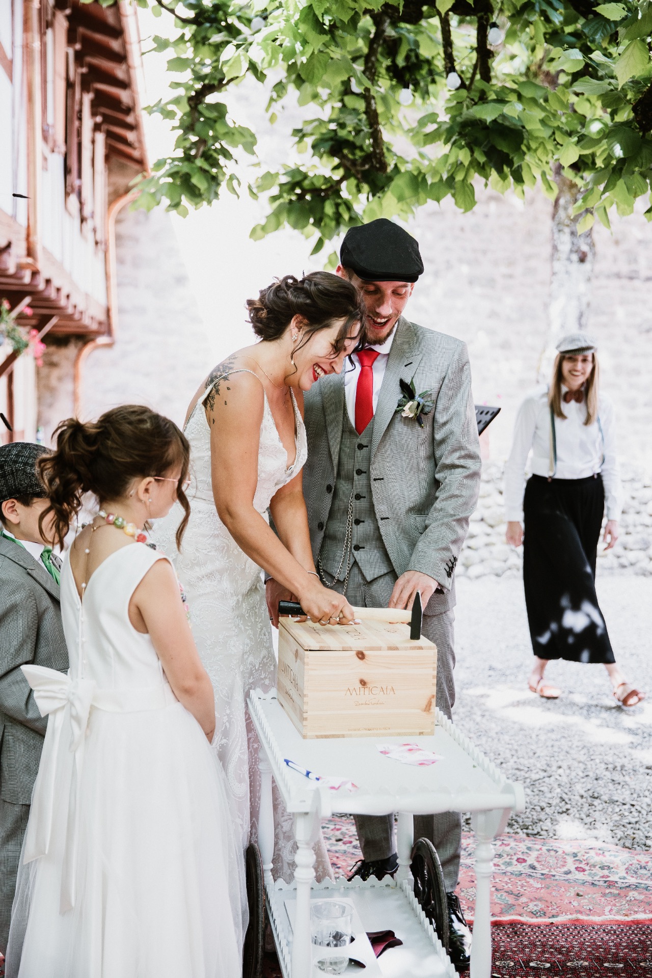 Nos amoureux, grands fan de vins (tu peux les retrouver dans leur propre Bar à Vin à La Sarraz d’ailleurs !) ont ajouté cette passion à leur cérémonie avec une caisse scellée. Mariage personnalisé on a dit ! 🤩