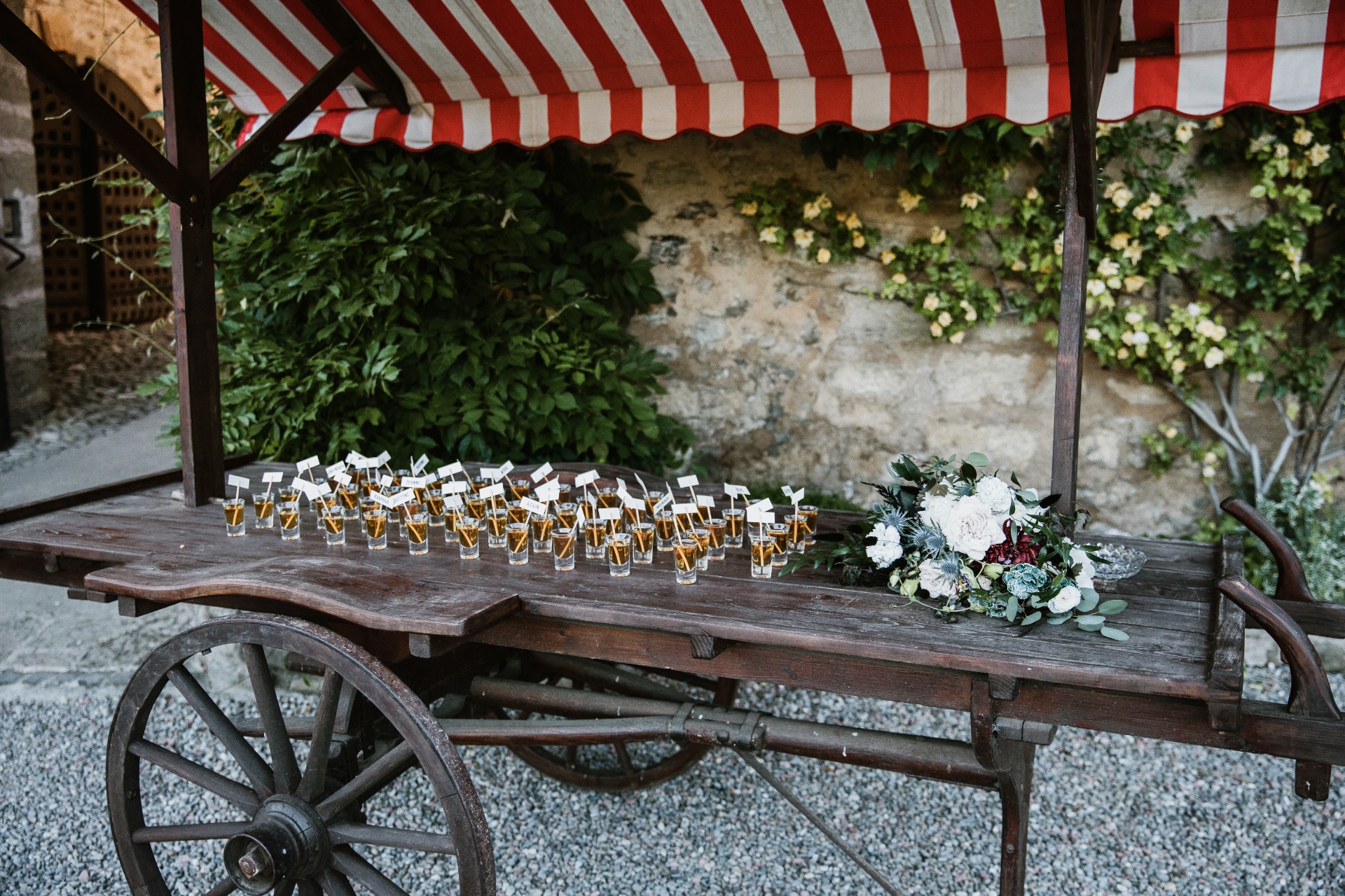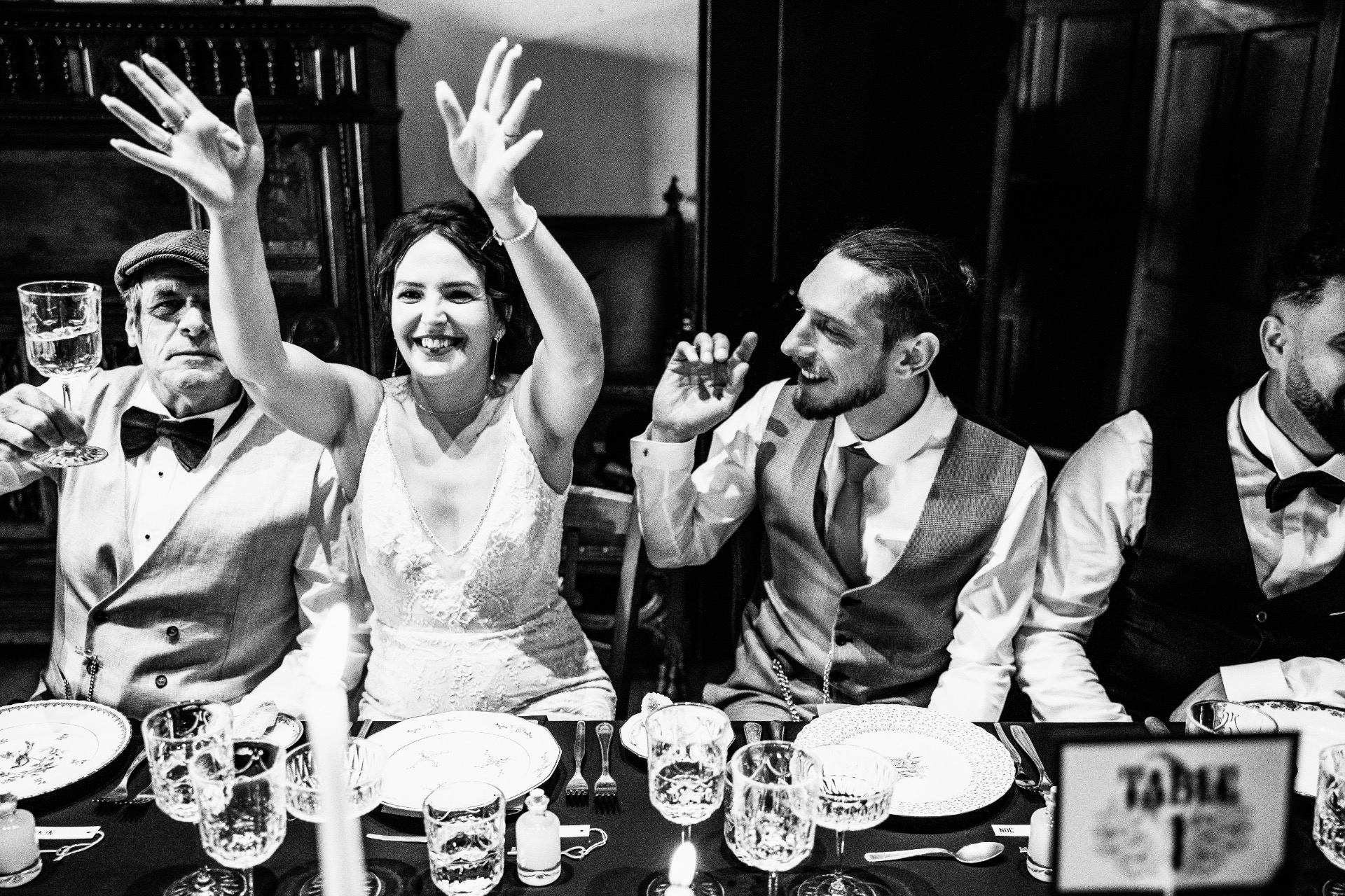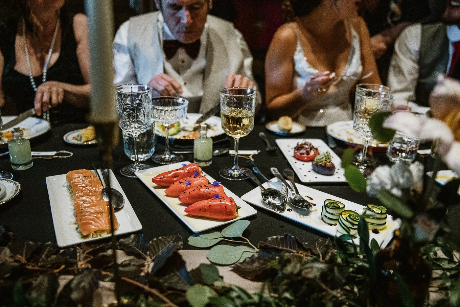 Quoi de mieux pour lancer l’entrée en salle pour le souper qu’une tournée générale de shots ? … Eh bien… Embarquer leurs invités dans un storytelling bien ficelé : nos mariés ont créé avec Don et Zagro, les vidéastes de ce mariage une vidéo avant le jour J, dont l’apothéose était leur arrivée au château après un braquage. Je te dis pas le FEU sur l’ambiance quand ils ont passé la porte !!