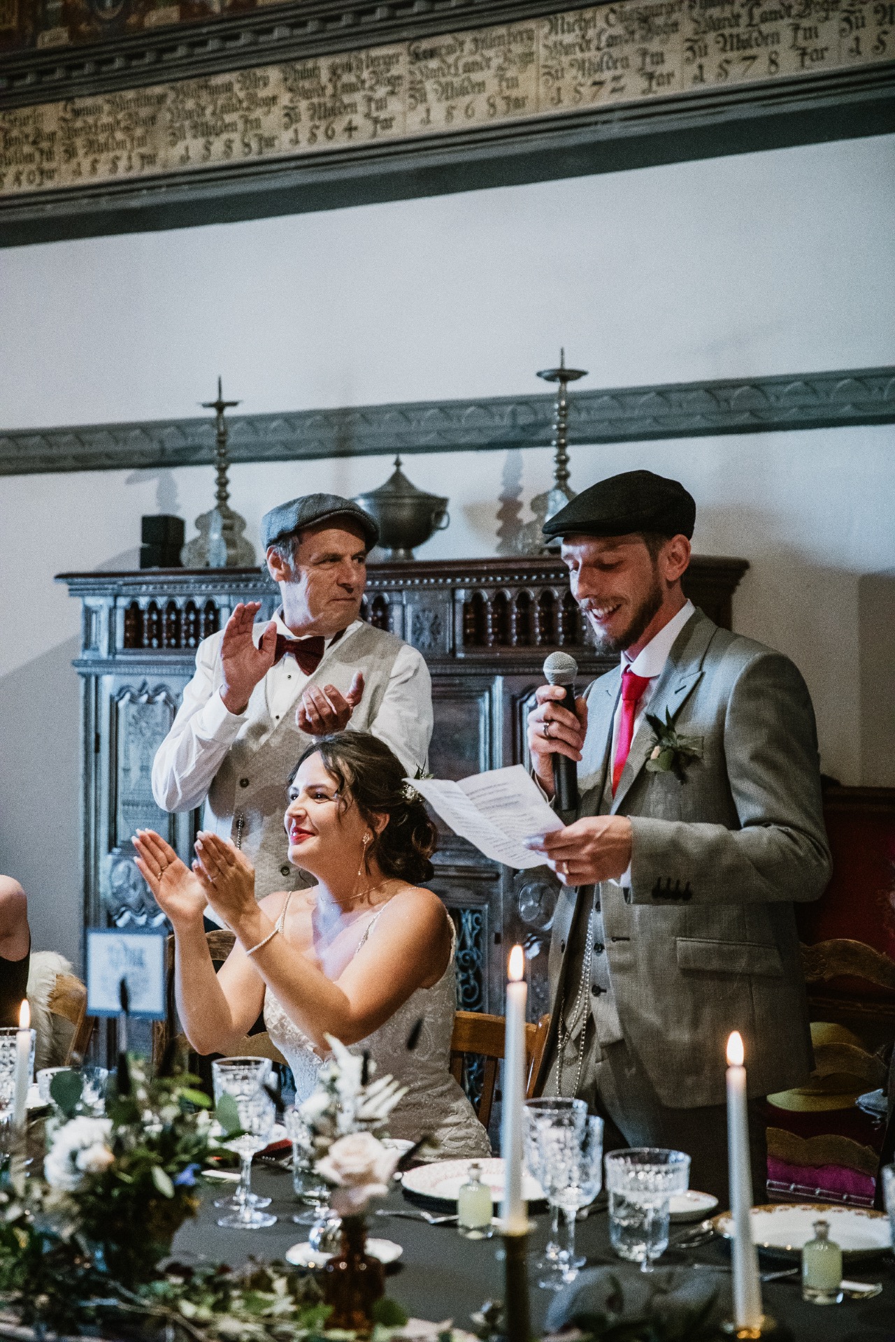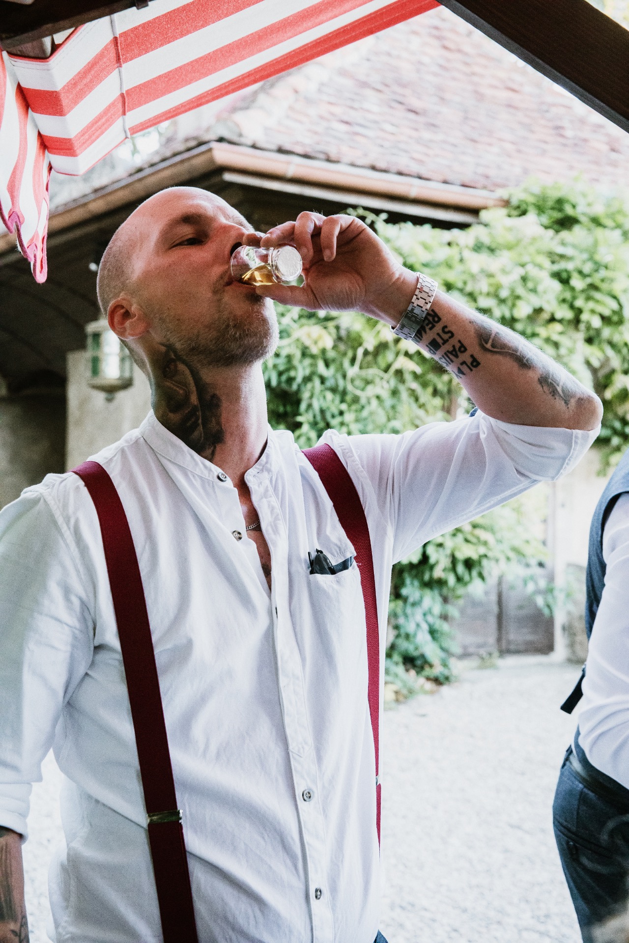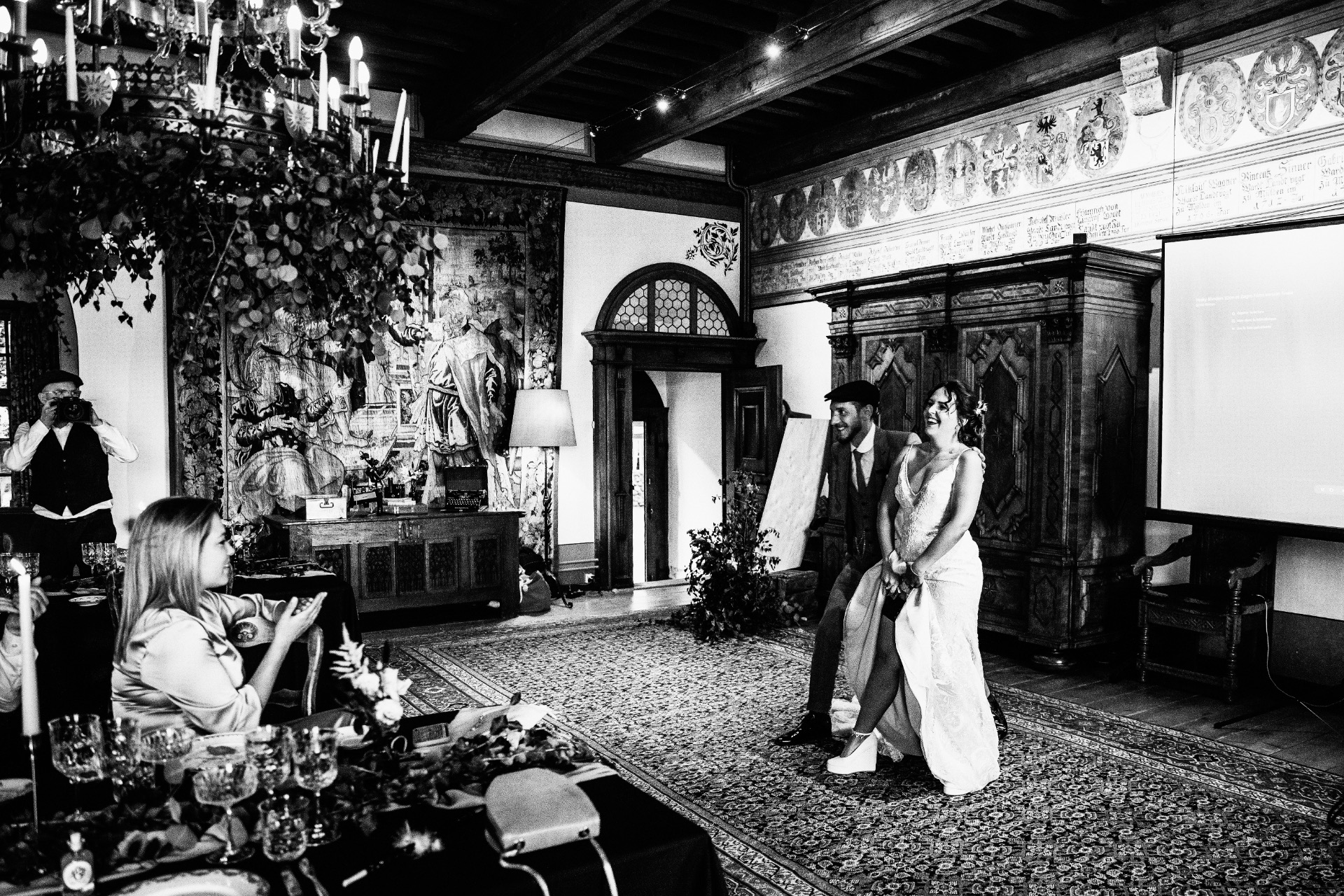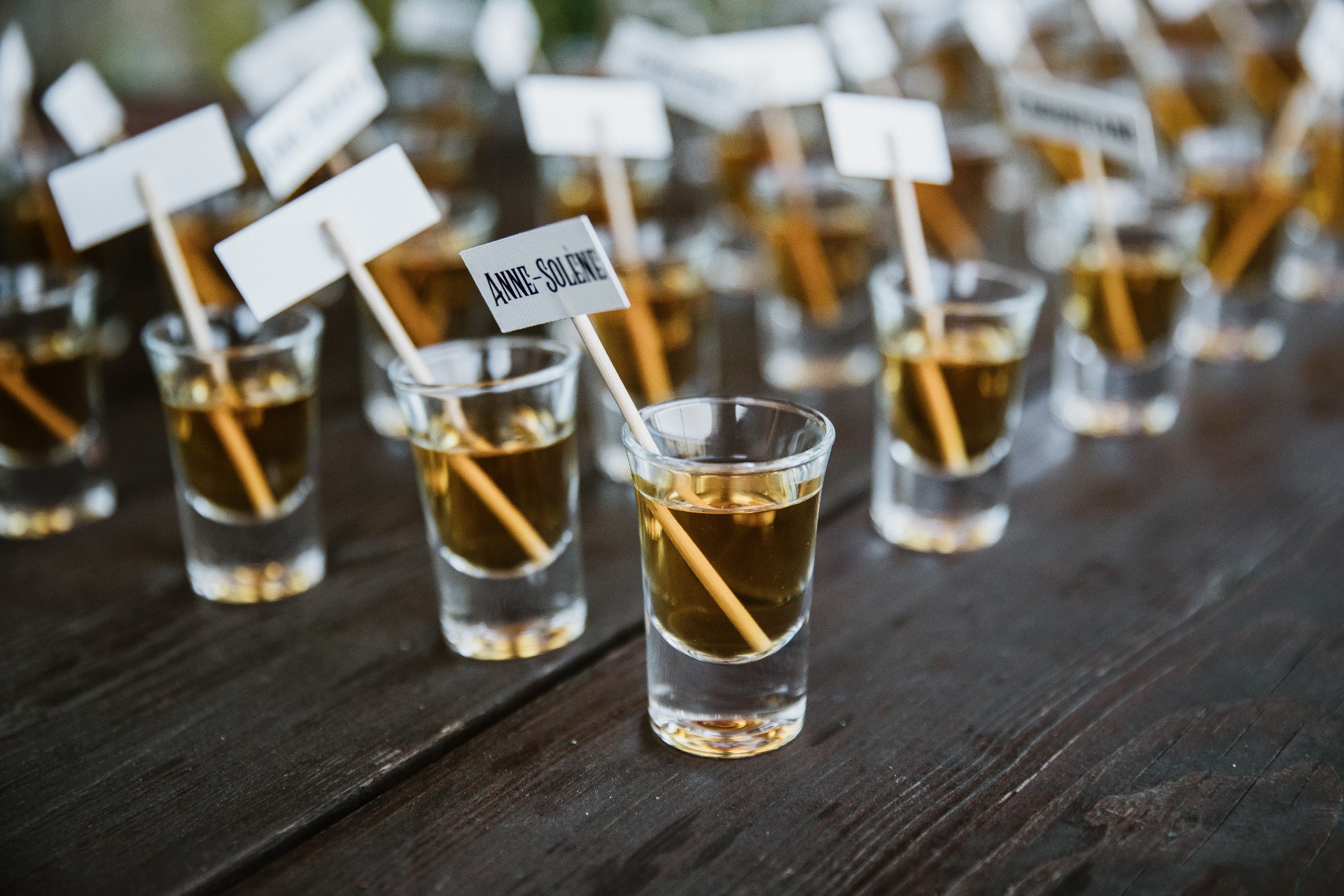 Quoi de mieux pour lancer l’entrée en salle pour le souper qu’une tournée générale de shots ? … Eh bien… Embarquer leurs invités dans un storytelling bien ficelé : nos mariés ont créé avec Don et Zagro, les vidéastes de ce mariage une vidéo avant le jour J, dont l’apothéose était leur arrivée au château après un braquage. Je te dis pas le FEU sur l’ambiance quand ils ont passé la porte !!