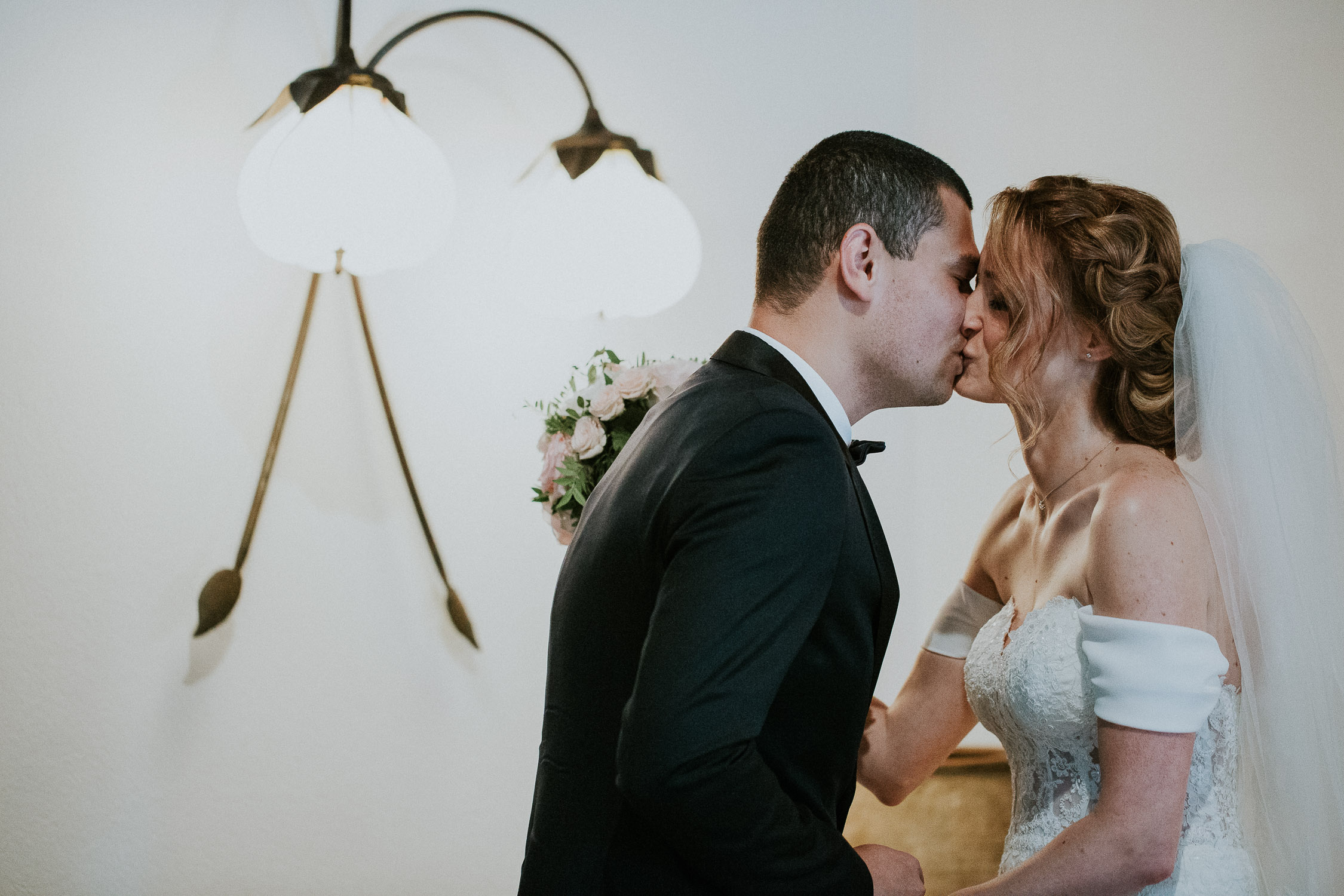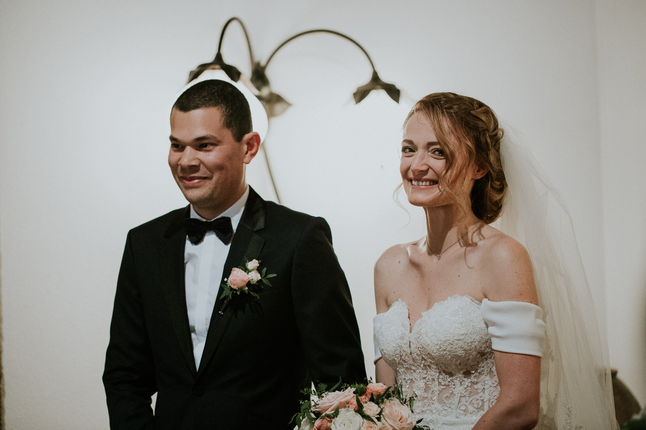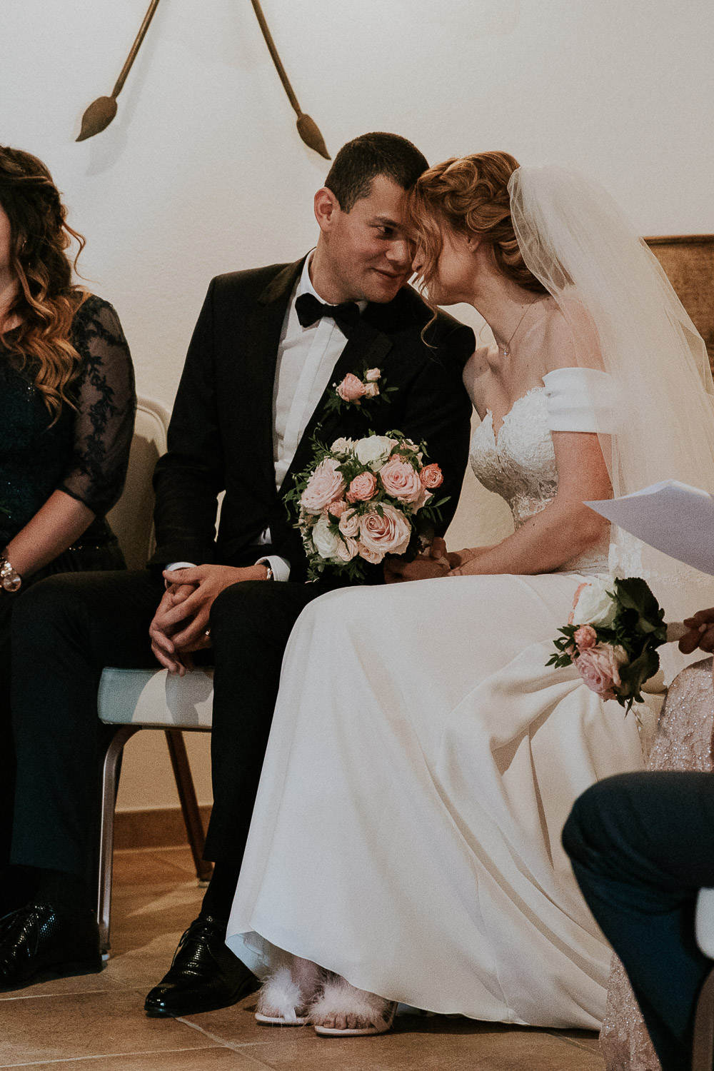 Une fois notre mariée prête, la cérémonie pouvait commencer. Sa robe était à couper le souffle ! Elle était complétée par un très long voile, accroché dans sa coiffure grâce à un peigne. La cérémonie de mariage se déroulait directement à la Porte des Iris, dans une petite salle dédiée, avec un officiant de l’état de Vaud. La salle était pleine, remplie de tout l’amour des familles et amis des mariés. De très émouvants discours se sont succédés, et les regards furent très humides, même les miens d’ailleurs (oui, je pleure toujours aux mariages haha !). La musique était live avec un duo de musicien et chanteuse.