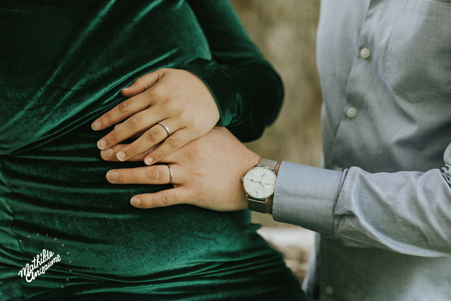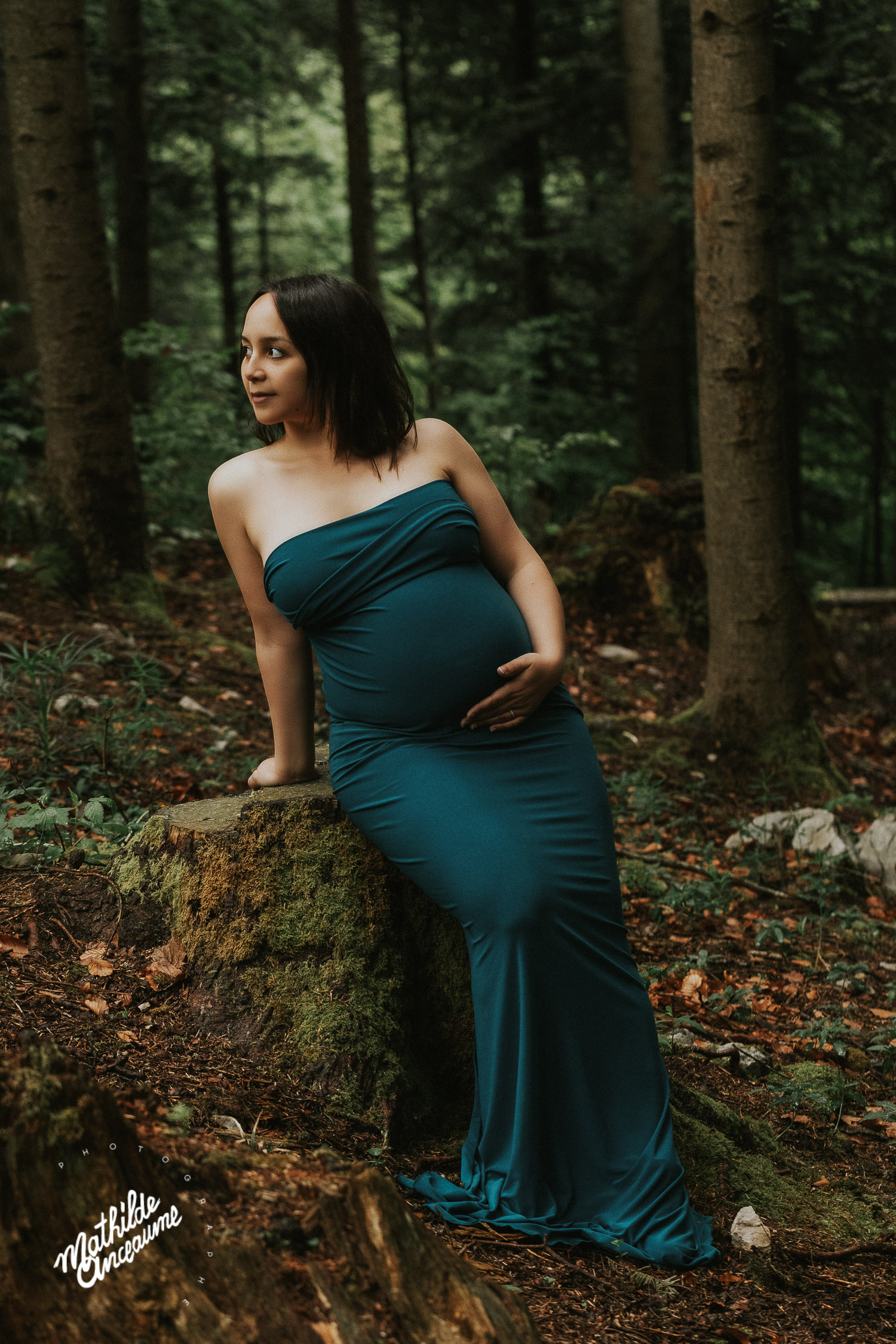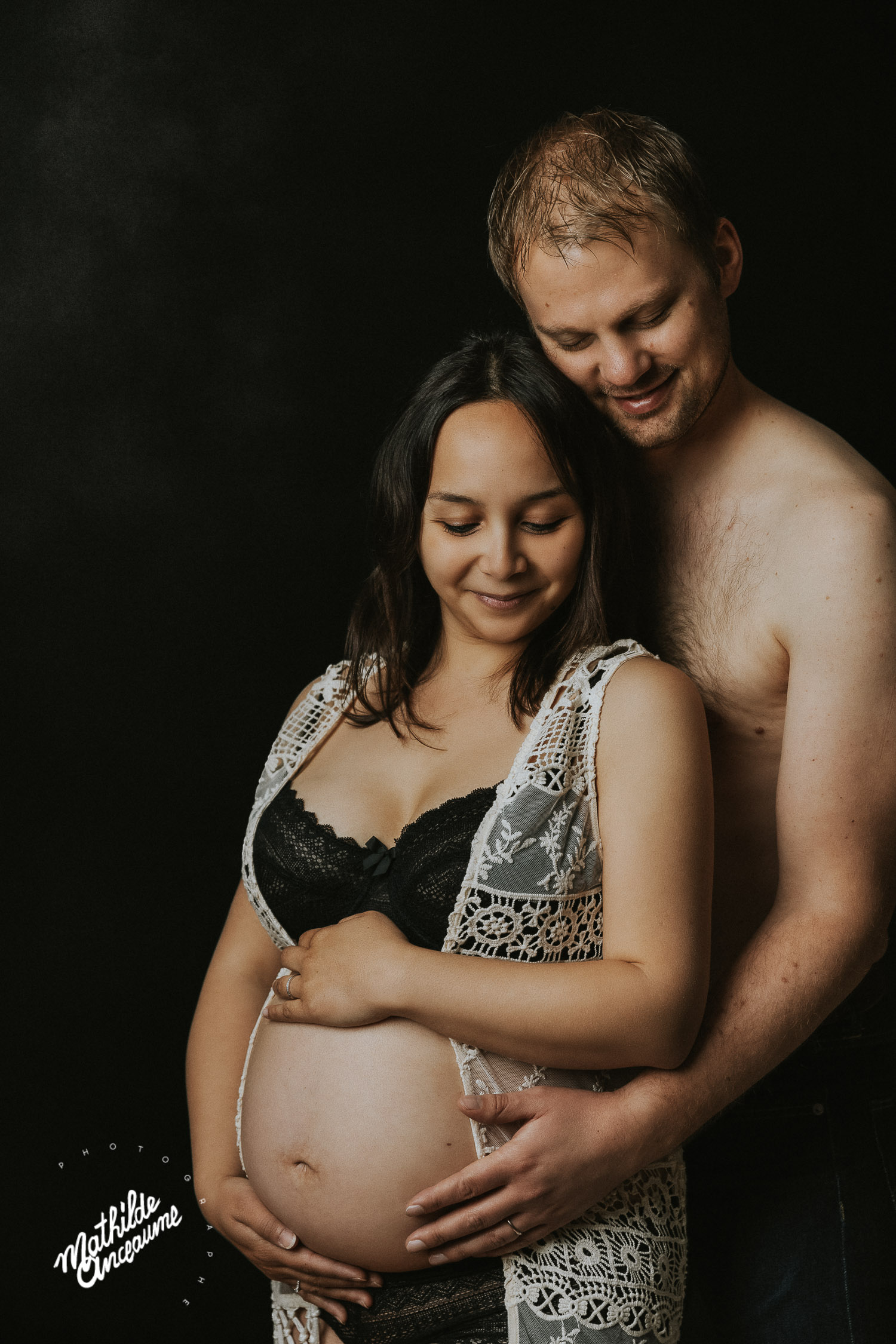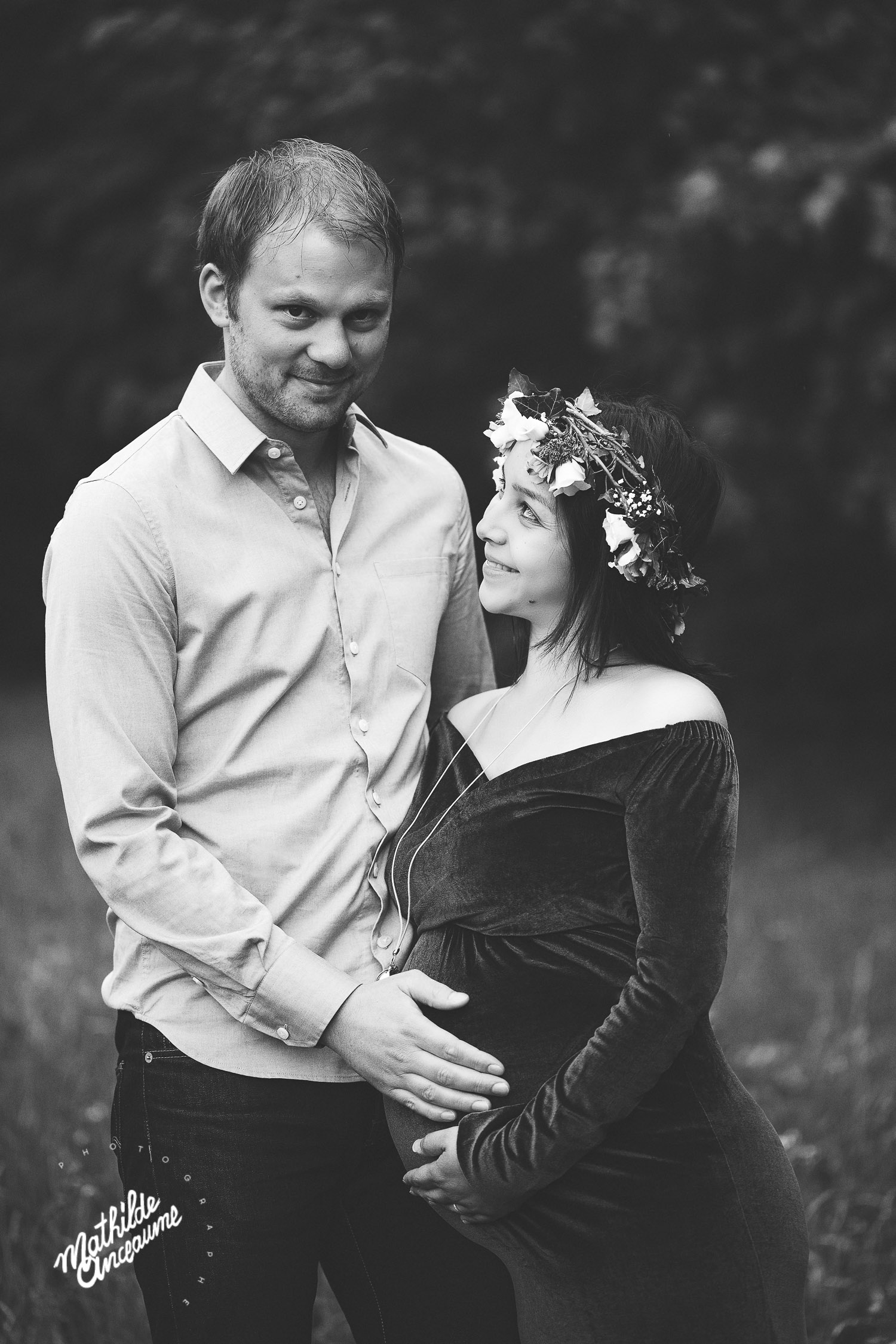 Ce gentil petit couple est venu me voir de très loin… En effet, ils sont venus jusqu’à ma Suisse depuis la région parisienne ! Ils tenaient à avoir mes photos pour ce moment si spécial, et rien n’aurait pu plus me toucher ! Les jours précédents leur arrivée furent pluvieux… orageux… Bref, nous avions un peu peur, mais finalement, la chance nous a sourit, et la pluie s’est arrêtée le temps de la séance photo de grossesse en extérieur. Ils avaient eu la formidable idée d’amener une couronne de fleurs fraiches, faite exprès pour l’occasion, celle-ci se mariait à la perfection avec le style de la séance photo. J’adore les fleurs, les végétaux, et j’en inclue volontiers dans mes séances photo, autant en séance grossesses que les séances nouveau-né ou portrait. Nous avons eu droit à une magnifique lumière d’après orage, douce et chaude. Après avoir passé 2 de mes nombreuses magnifiques robes (qui sont disponibles au studio pour les futures mamans !), nous avons également voulu immortaliser cette maternité en studio, pour voir ce joli ventre se découvrir. Une magnifique maman, d’une douceur et d’une gentillesse qui me font penser que ce bébé à venir a bien de la chance… Et un papa qui a l’air aux petits soins pour sa merveilleuse femme, qu’il regarde évoluer avec les vrais yeux de l’amour ! Ô bébé, tu es très désiré, et tes parents ont bien hâte de faire ta connaissance !